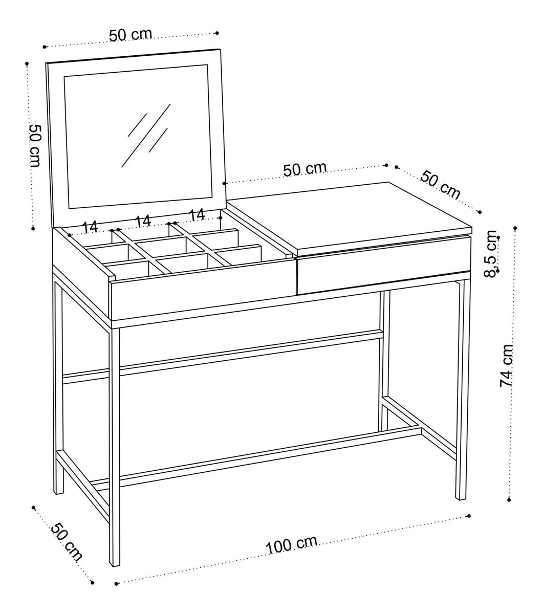 ZobrazitToaletní stolek - Ammy (Bílá + Černá) je praktickým a elegantním doplňkem pro vaši ložnici nebo šatník S výškou 74 cm, šířkou 100 cm a hloubkou 50 cm, tento stolek nabízí dostatek místa pro uskladnění vašich kosmetických a toaletních potřeb. bílou a černou barvu, což jej činí výrazným a stylovým prvkem vašeho interiéru Díky kvalitním materiálům je tento stolek odolný a trvanlivý Svými praktickými úložnými prostory a stylovým vzhledem je toaletní stolek - Ammy (Bílá + Černá) ideální volbou pro každého, kdo si chce vytvořit funkční a vkusné prostředí ve své ložnici nebo šatníku.