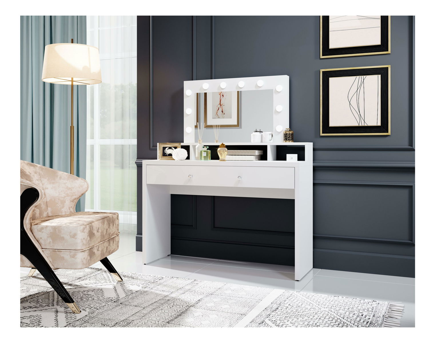 Elegantní toaletní stolek s osvětleným zrcadlem. Široká deska a zásuvky pro uložení vašich doplňků, kosmetiky a šperků. Výjimečný kousek do elegantní ložnice ze série Arnette. Led osvětlení v ceně balení.