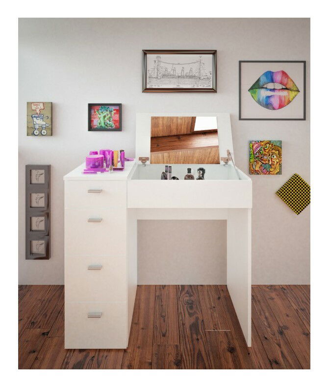 Toaletní stolek, který je šetrný k prostoru a zároveň nabízí dostatečné místo na vaše potřebné věci. Stolek nabízí úložný prostor v podobě 4 zásuvek. Na vrchní výklopné desce najdete z vnitřní strany zrcadlo. Stolek je vyroben ze 16 mm laminované dřevotřísky.