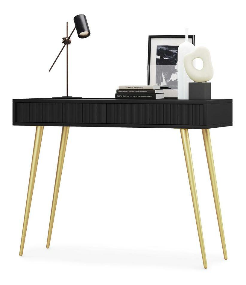 ZobrazitHledáte nábytek, který vám pomůže zařídit jedinečný prostor jako z časopisu o interiérovém designu? S toaletním stolkem rychle a jednoduše změníte svůj obývací pokoj k nepoznání! Toaletní stolek je jedinečný design a funkčnost v jednom. Jednoduchá forma na zlatých, úzkých nožičkách je obohacena o módní lamely vpředu, díky čemuž působí celek velmi styl. Úspěšně zapadne do interiérů zařízených v moderním, minimalistickém a industriálním stylu, kde se nepochybně stane ozdobou místnosti. Výhodou toaletního stolku jsou dva šuplíky, které vám umožní skrýt vaše soukromé věci před zraky hostů, zatímco prostorná pracovní deska bude skvělým místem pro vystavení vázy s květinami nebo stylových doplňků. Detaily produktu: korpus vyrobený - 16mm laminovaná dřevotříska, která díky své odolnosti proti vlhkosti a poškrábání zajišťuje dlouhé používání, vysoké nožičky odlehčují nábytek a usnadňují udržování pořádku, hrany nábytku jsou zpevněny ABS hranou, nábytek lze složit svépomocí.