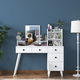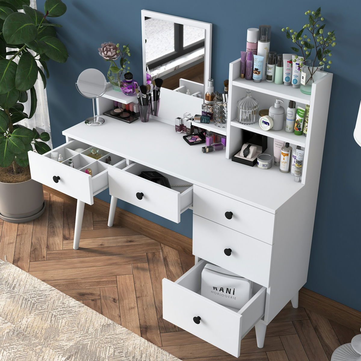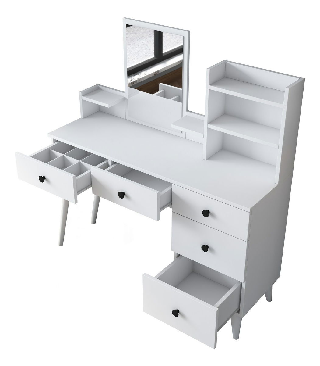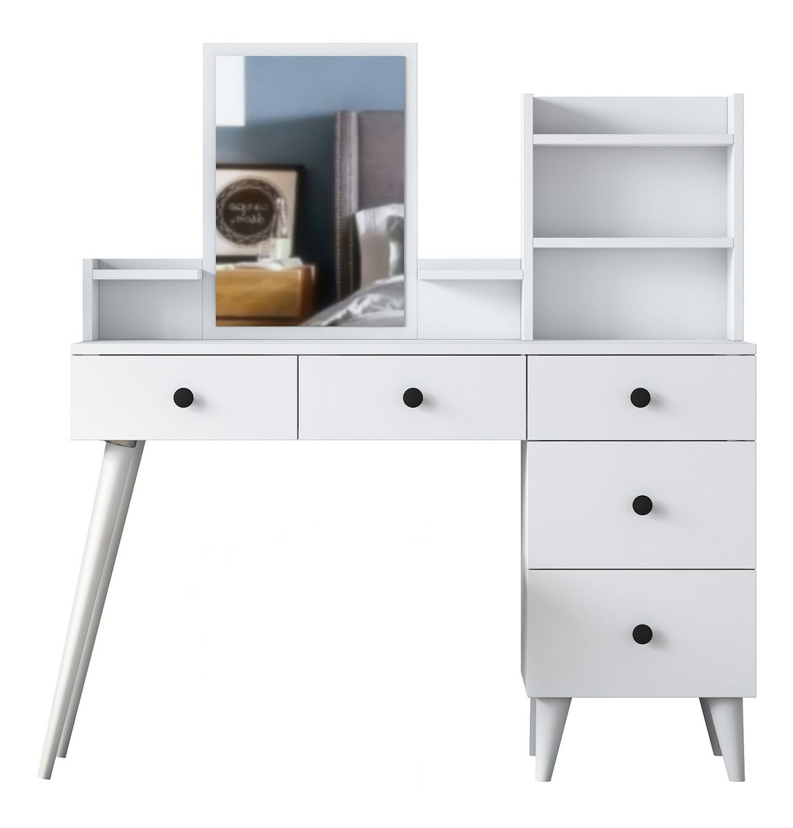 ZobrazitToaletní stolek - Blake 101 (Bílá) je elegantní kus nábytku, který bude skvělým doplňkem vašeho interiéru. S výškou 93 cm, šířkou 122.2 cm a hloubkou 40 cm poskytuje dostatek prostoru pro vaše kosmetické potřeby a osobní věci. Jeho bílá barva přidává do vašeho prostoru svěží a moderní vzhled. Stolek je vyroben z kvalitního materiálu, který zajišťuje dlouhou životnost a odolnost vůči poškození. S jeho praktickým designem a dostatečným úložným prostorem je toaletní stolek Blake 101 ideálním řešením pro každou moderní ložnici.