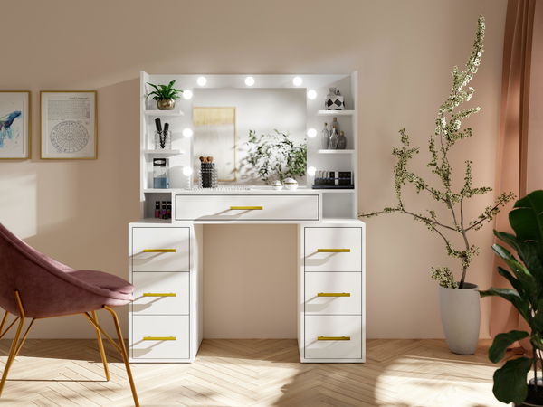Toaletní stolek Bronetta 1 se zásuvkami, velkým zrcadlem s LED osvětlením a praktickými policemi představuje ideální řešení pro ty, kteří ocení spojení funkčnosti s elegantním designem. Řada zásuvek poskytuje dostatek prostoru pro uskladnění kosmetiky, šperků či doplňků, což usnadňuje udržování pořádku a organizaci. Velké zrcadlo s kvalitním osvětlením zajišťuje přesné líčení a zároveň dodává místnosti luxusní vzhled. Police umožňují vystavení oblíbených produktů, čímž nábytku přidávají stylový nádech. Pevná konstrukce z kvalitních materiálů garantuje dlouhodobou odolnost a stabilitu. Elegantní vzhled stolku se jednoduše začlení do různých interiérů, čímž vytváří harmonický a sofistikovaný prostor pro každodenní péči.