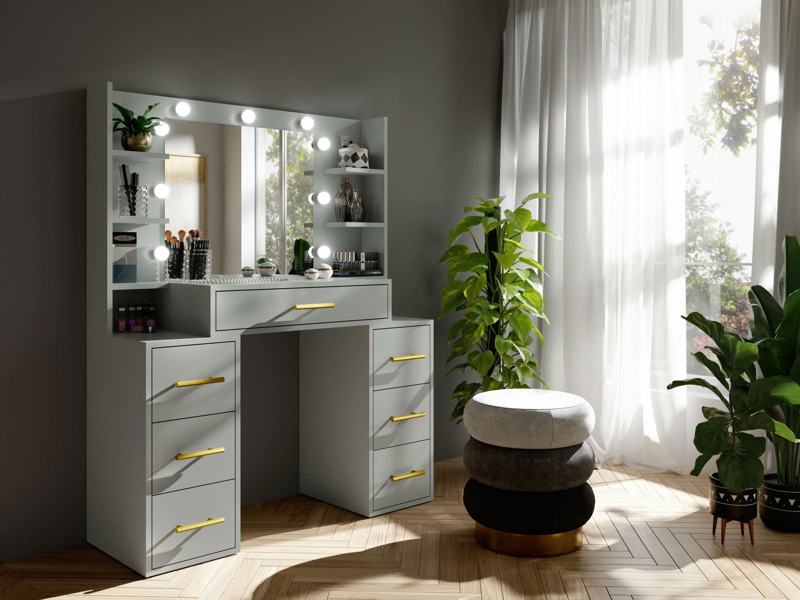 Toaletní stolek Bronetta 1 se zásuvkami, velkým zrcadlem s LED osvětlením a praktickými policemi představuje ideální řešení pro ty, kteří ocení spojení funkčnosti s elegantním designem. Řada zásuvek poskytuje dostatek prostoru pro uskladnění kosmetiky, šperků či doplňků, což usnadňuje udržování pořádku a organizaci. Velké zrcadlo s kvalitním osvětlením zajišťuje přesné líčení a zároveň dodává místnosti luxusní vzhled. Police umožňují vystavení oblíbených produktů, čímž nábytku přidávají stylový nádech. Pevná konstrukce z kvalitních materiálů garantuje dlouhodobou odolnost a stabilitu. Elegantní vzhled stolku se jednoduše začlení do různých interiérů, čímž vytváří harmonický a sofistikovaný prostor pro každodenní péči.