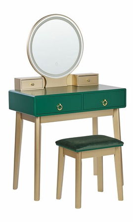 Vytvořte si jedinečný kosmetický koutek pomocí stylového toaletního stolku s elegantním vzhledem. Součástí stolku je zrcadlo se zabudovanou LED diodou, která má tři režimy, díky kterým bude líčení preciznější a jednodušší. Do 4 prostorných zásuvek se vejde nejen kosmetika, ale také šperky, protože jedna přihrádka má také praktický organizér na prsteny, náramky nebo náušnice. Pohodlně se posaďte na židli s elegantním sedadlem, která krásně ladí s designem stolku, a užívejte si každodenní kosmetickou rutinu.