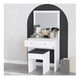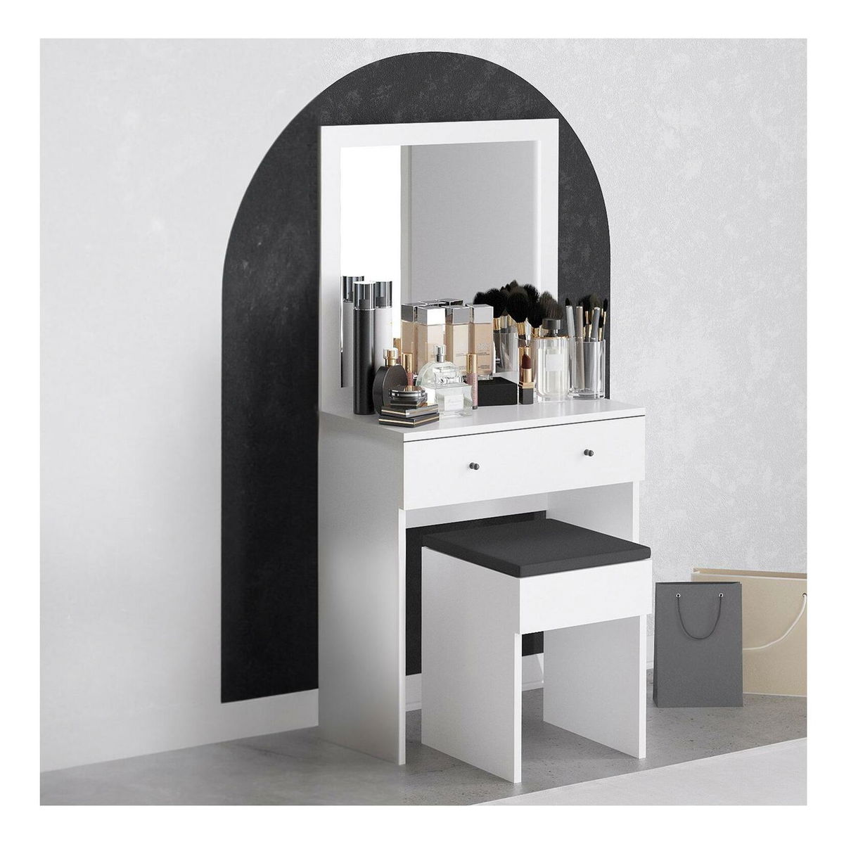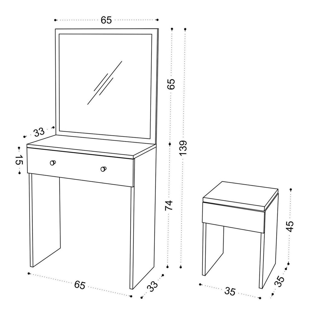 tloušťka: 18 mm, velikost kosmetického stolu: šířka: 65 cm, výška: 139 cm, hloubka: 35 cm, velikost židle: šířka: 39 cm, výška: 45 cm, hloubka: 35 cm