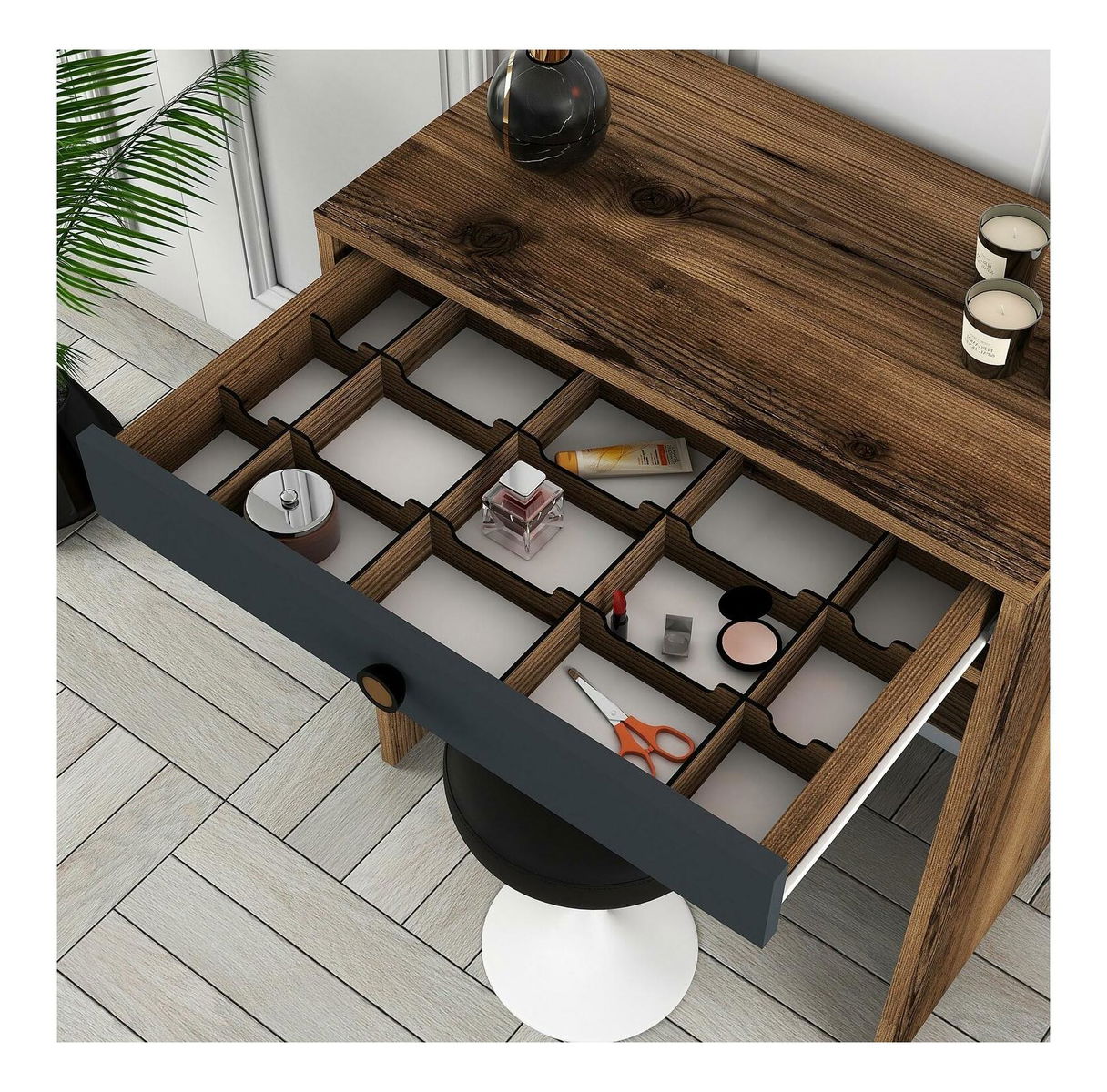 tloušťka: 18 mm, velikost kosmetického stolu: šířka: 70 cm, výška: 40 cm, hloubka: 84,7 cm, velikost zrcadla: šířka: 51 cm, výška: 76,5 cm, hloubka: 2 cm