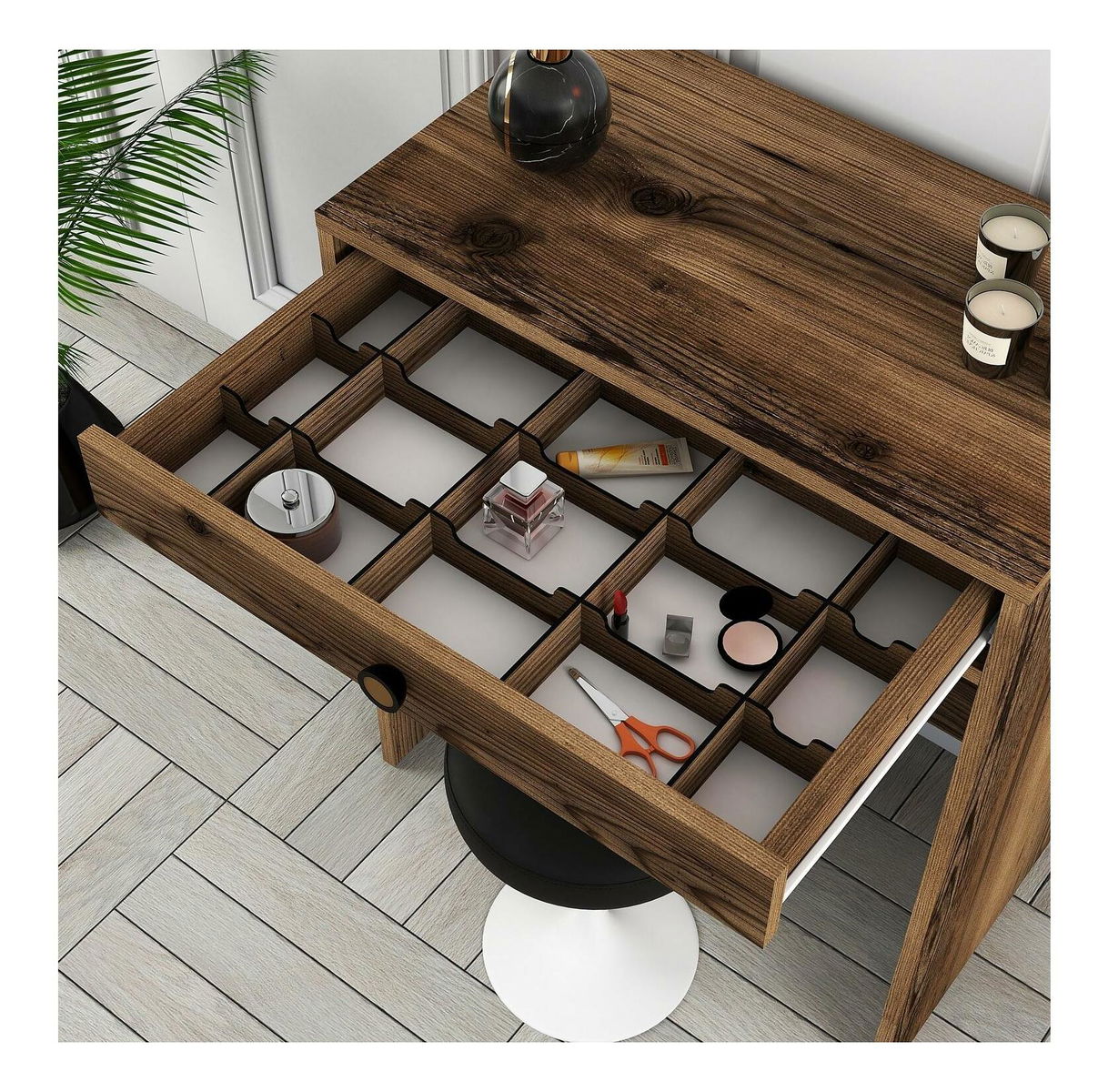 tloušťka: 18 mm, velikost kosmetického stolu: šířka: 70 cm, výška: 40 cm, hloubka: 84,7 cm, velikost zrcadla: šířka: 51 cm, výška: 76,5 cm, hloubka: 2 cm