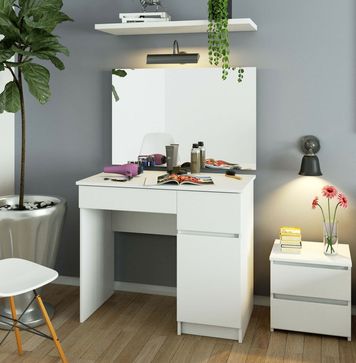 Toaletní stolek Parijat se může pyšnit bílým zrcadlem, 2 zásuvkami a prostornou skříňkou. Dobře poslouží v ložnici, ale také v kosmetických salonech, kde velké zrcadlo zaručí pohodlné pracovní podmínky. Výška toaletního stolku bez zrcadla: 77 cm. Výška toaletního stolku se zrcadlem je 142 cm. Přírodní tóny barev a jednoduchost tvaru zaručuje, že nábytek zapadá do současných trendů interiérového designu. Toaletní stolek je vyroben z kvalitní laminované desky odolné vůči oděru. Hrany nábytku jsou chráněny ABS dýhou. Zásuvky se snadno pohybují na kovových válečkových vodítkách. Dostupný iv jiných barevných provedeních.