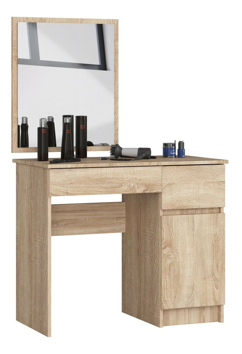 ZobrazitToaletní stolek Pritha se může pyšnit zrcadlem, 2 zásuvkami a prostornou skříňkou. Dobře poslouží v ložnici, ale také v kosmetických salonech, kde velké zrcadlo zaručí pohodlné pracovní podmínky. Výška toaletního stolku bez zrcadla: 77 cm. Výška toaletního stolku se zrcadlem je 142 cm. Přírodní tóny barev a jednoduchost tvaru zaručuje, že nábytek zapadá do současných trendů interiérového designu. Toaletní stolek je vyroben z kvalitní laminované desky odolné vůči oděru. Hrany nábytku jsou chráněny ABS dýhou. Zásuvky se snadno pohybují na kovových válečkových vodítkách.