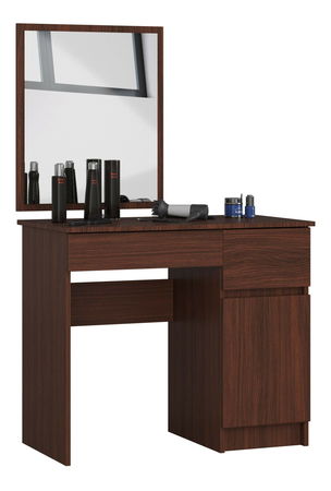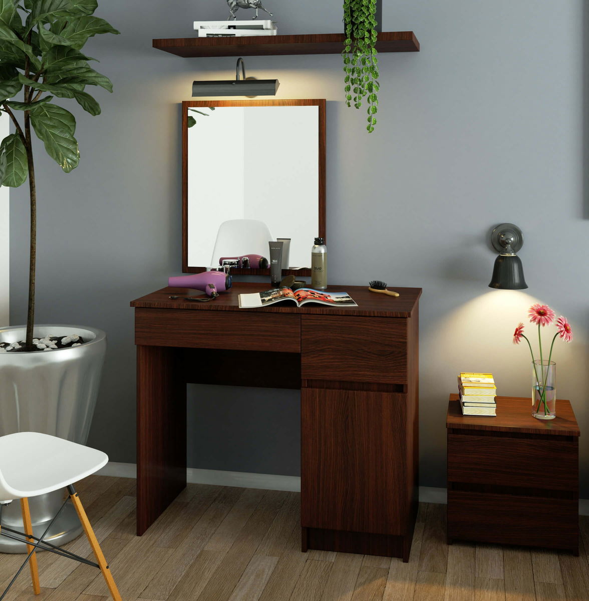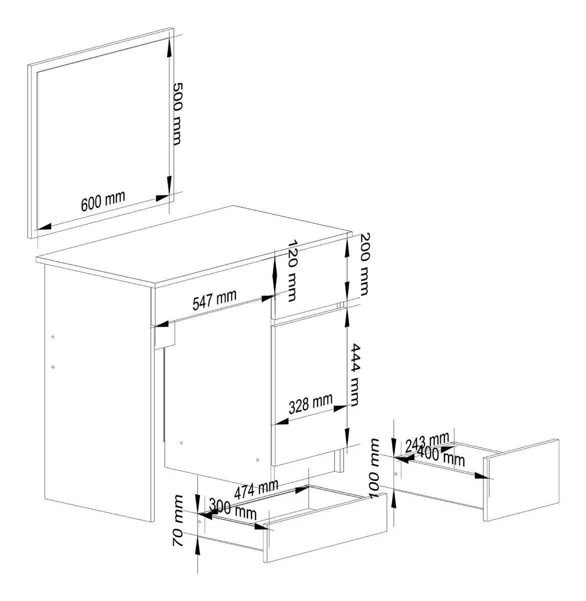 ZobrazitToaletní stolek Pritha se může pyšnit zrcadlem, 2 zásuvkami a prostornou skříňkou. Dobře poslouží v ložnici, ale také v kosmetických salonech, kde velké zrcadlo zaručí pohodlné pracovní podmínky. Výška toaletního stolku bez zrcadla: 77 cm. Výška toaletního stolku se zrcadlem je 142 cm. Přírodní tóny barev a jednoduchost tvaru zaručuje, že nábytek zapadá do současných trendů interiérového designu. Toaletní stolek je vyroben z kvalitní laminované desky odolné vůči oděru. Hrany nábytku jsou chráněny ABS dýhou. Zásuvky se snadno pohybují na kovových válečkových vodítkách.