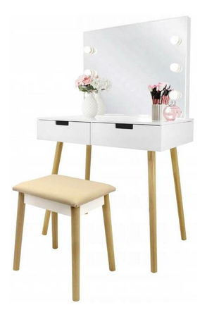 Toaletní stolek s osvětlením ve tvaru žárovek ve velkém zrcadle je jistě snem většiny žen! Je to funkční a praktické řešení. Umožní vám uložit si oblíbenou kosmetiku nebo šperky, díky čemuž budete mít po ruce všechny potřebné předměty. O pohodlí používání je zodpovědné příslušné zrcadlo se 6 LED světly. Stolek má dřevěné nohy a je vyhotven ve stylu retro. Každá žena se bude cítit jako hollywoodská herečka.
