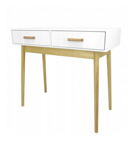 Toaletka ve skandinávském stylu je dokonalým řešením pro lidi, kteří mají rádi minimalistické byty a kanceláře. Má lakovaný vršek z MDF desky a dřevěné nohy, které jí dodávají moderní styl. Je to funkční a praktické řešení nejen do ložnice, ale i menší pracovny. Umožňuje vám uložit vaši oblíbenou kosmetiku nebo šperky ve dvou prostorných šuplících.