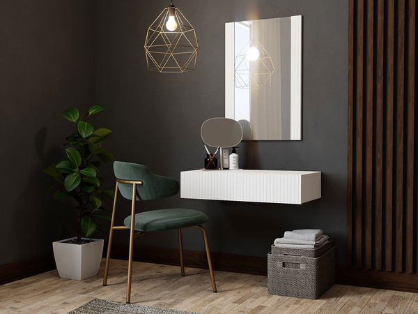 ZobrazitToaletní stolek se zrcadlem je mimořádně funkční a zároveň krásný kus nábytku, který by rozhodně neměl chybět v žádné ložnici. Objemná zásuvka je ideální pro odkládání drobných doplňků a kosmetiky. Hlavní devizou toaletního stolku na zeď je velké zrcadlo, které usnadňuje provádění všech úkonů péče o tělo. Na jeho vrchní část můžete umístit šperkovnici nebo oblíbený parfém. Design toaletního stolku do ložnice je velmi estetický a poutavý. Frézování viditelné na čele zásuvky i na bocích zrcadla působí elegantně a moderně. Celý kus je vyroben z kvalitní laminované desky.
