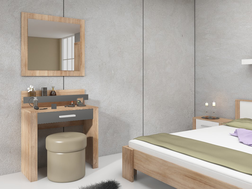 Krásný a nepřehlédnutelný toaletní stolek Viki stojící na dvou širokých nohách. Stolek má jednu širokou zásuvku s jedním madlem. K horní desce je připojena deska, na které se nachází uchycené na zrcadlo. Potěšte svou manželku toaletním stolkem za neuvěřitelnou cenu.