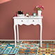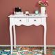 Ozdobný toaletní stolek, který bude elegantním doplňkem vašich ložnic. Ozdobný barokní styl se hodí do tradičnější zařízených domácností nebo do domácností, které podobné barokní prvky obsahují. Stolek má dvě zásuvky s ozdobnými úchyty. Stolek stojí na vysokých vyřezávaných nožičkách. Barevné provedení stolku je bílá.