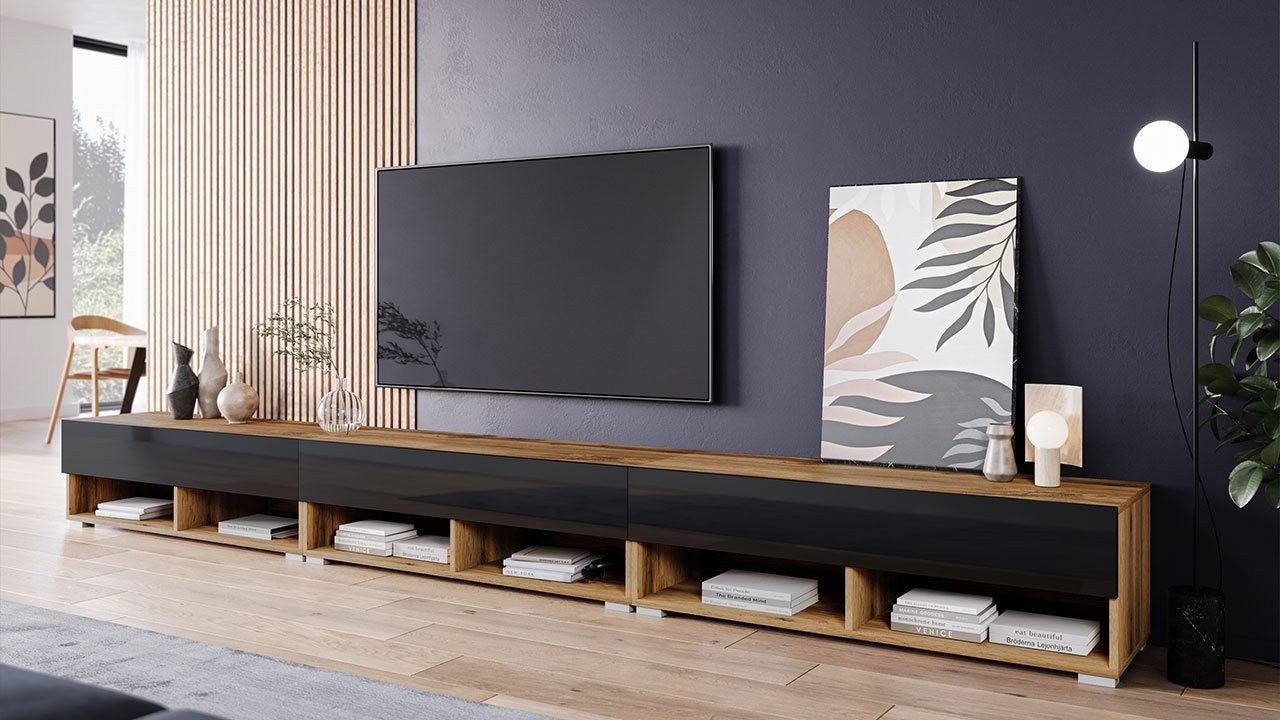 ZobrazitPokud máte na zdi velkou plochu a chcete si zařídit praktický televizní koutek, podívejte se na náš návrh - TV skříňka Adenik 300. Tento zajímavý model má šířku až 300 cm. Takový povrch je ideální základnou pro multimediální zařízení, knihy, ozdoby a vše, co na něj chcete umístit. Nabízí otevřené i uzavřené police. Moderní vzhled umocňuje absence úchytek a otevírání je velmi snadné díky čelům, které jemně vyčnívají nad horní část. Adenik 300 je mimořádně všestranný kus nábytku. V balení je také montážní příslušenství, díky kterému ji můžete zavěsit na zeď nebo umístit na podlahu.