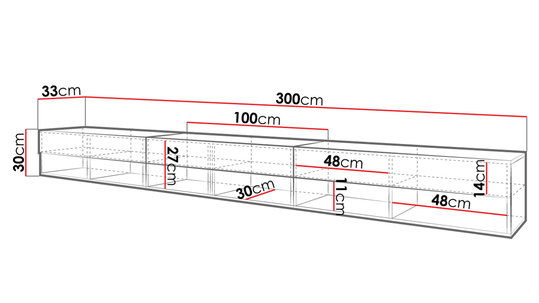 Pokud máte na zdi velkou plochu a chcete si zařídit praktický televizní koutek, podívejte se na náš návrh - TV skříňka Adenik 300. Tento zajímavý model má šířku až 300 cm. Takový povrch je ideální základnou pro multimediální zařízení, knihy, ozdoby a vše, co na něj chcete umístit. Nabízí otevřené i uzavřené police. Moderní vzhled umocňuje absence úchytek a otevírání je velmi snadné díky čelům, které jemně vyčnívají nad horní část. Adenik 300 je mimořádně všestranný kus nábytku. V balení je také montážní příslušenství, díky kterému ji můžete zavěsit na zeď nebo umístit na podlahu.