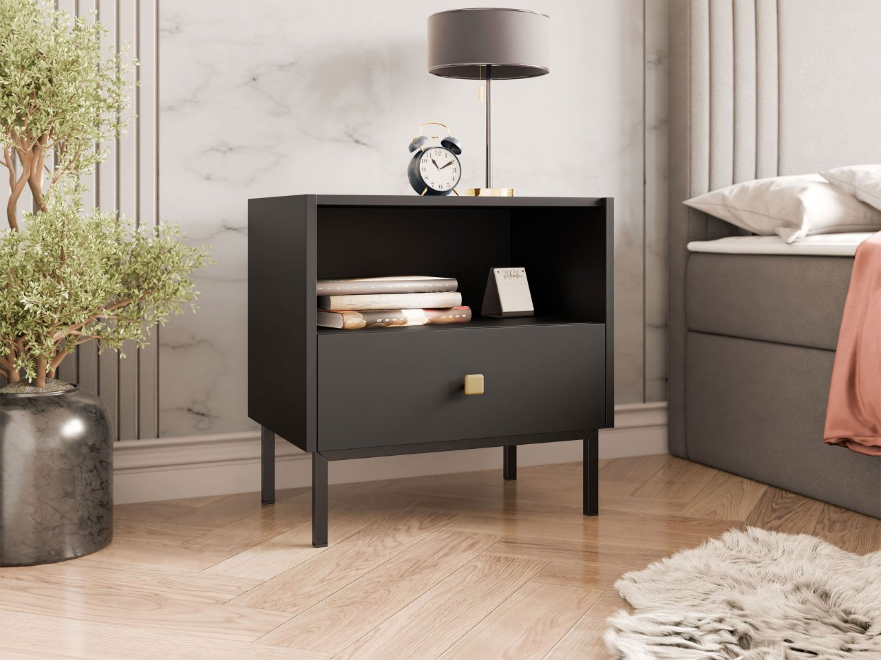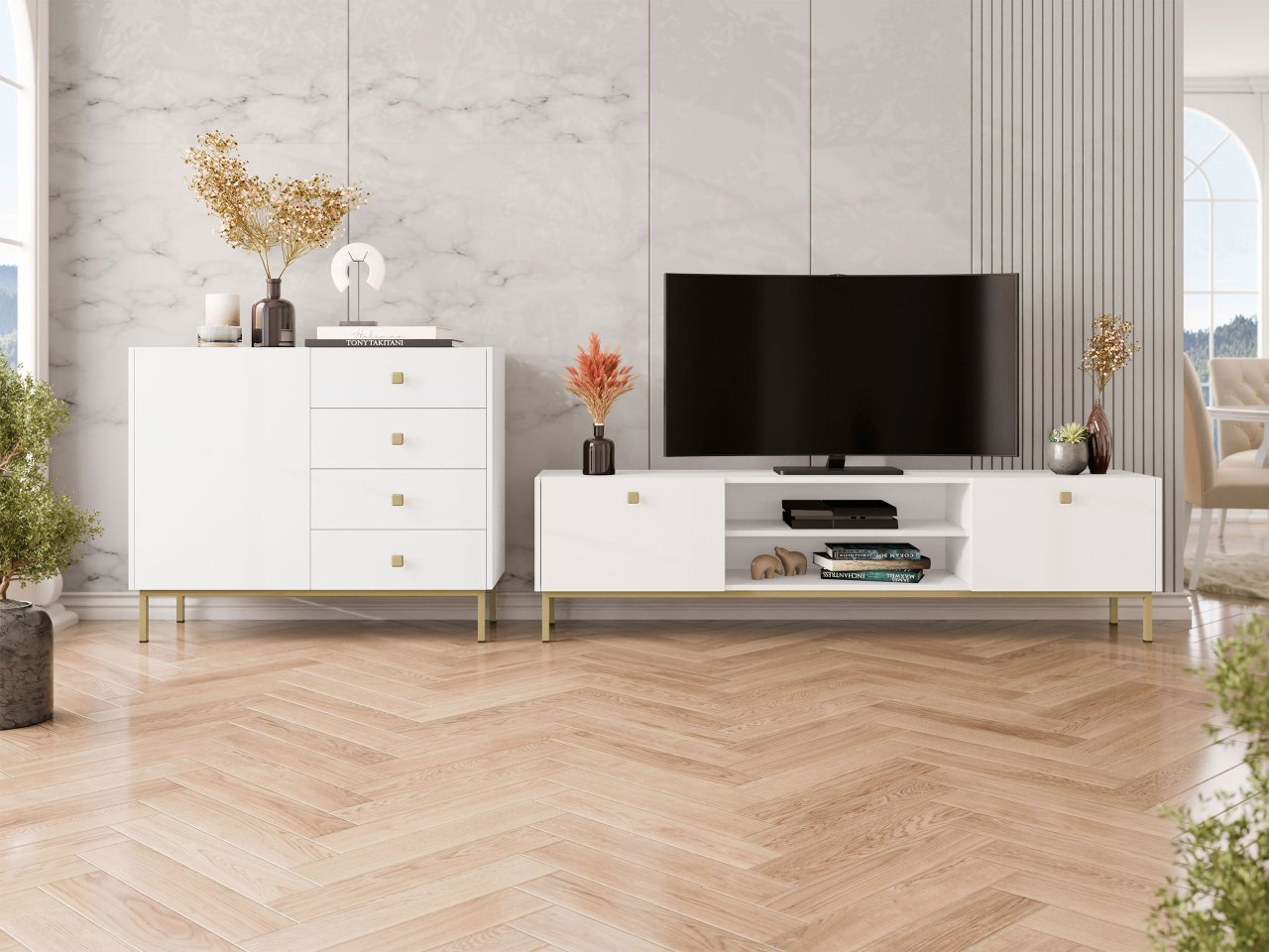 Ideálním způsobem, jak vytvořit funkční televizní prostor v menší místnosti, je zakoupení moderní TV skříňky Probazzo 1KW. Představený model poskytne prostor pro audiovizuální zařízení a další prvky. Výhodou TV skříňky je její vyšší osazení na kovovém rámu. Díky tomu působí v místnosti šetrně a usnadňuje její čištění. Skříňka má úchytku ve zlaté barvě, díky které můžete otevřít klapku a umístit dovnitř skříňky další předměty. Tato TV skříňka se bude dobře hodit do ložnice i do obývacího pokoje.