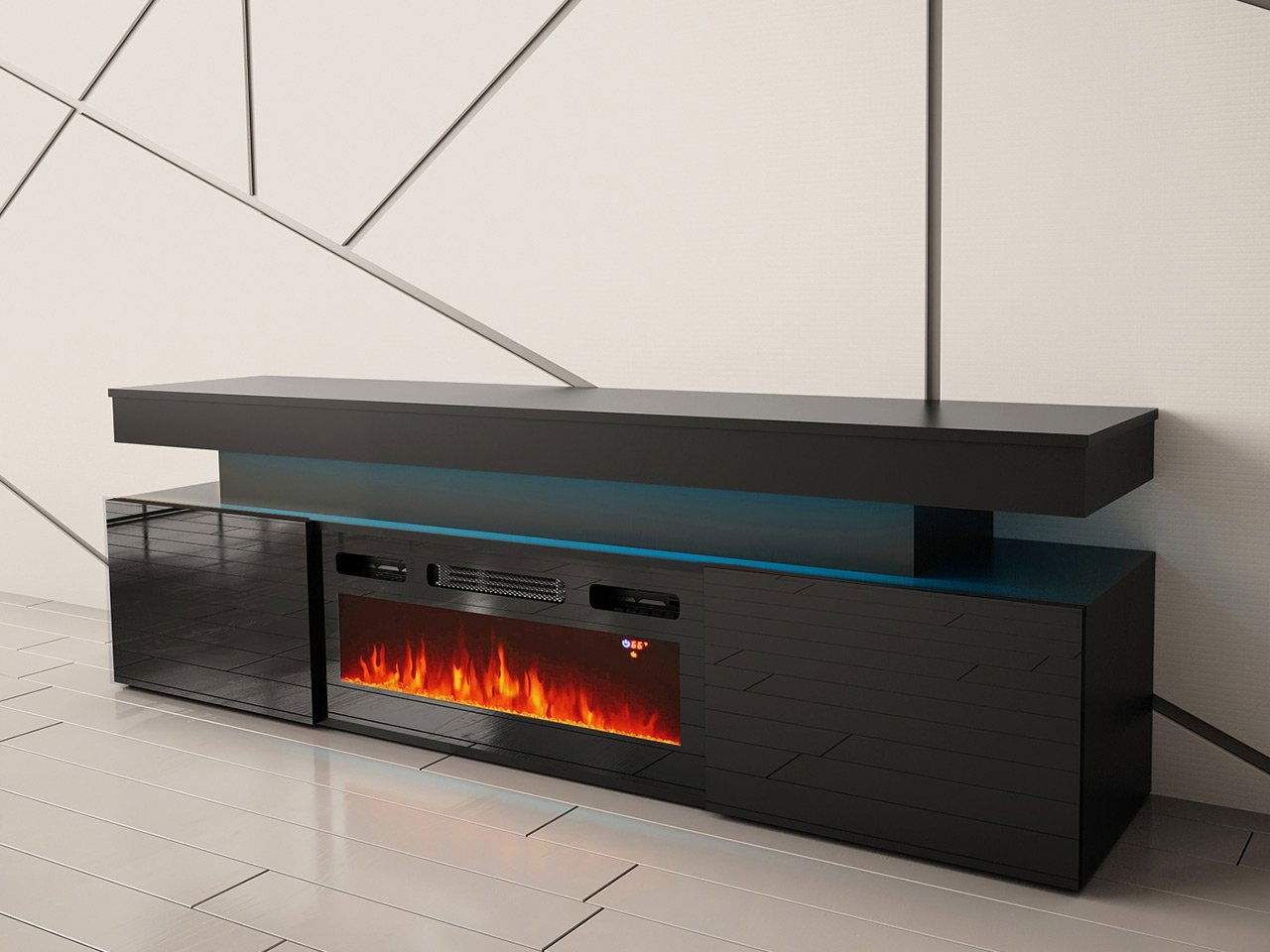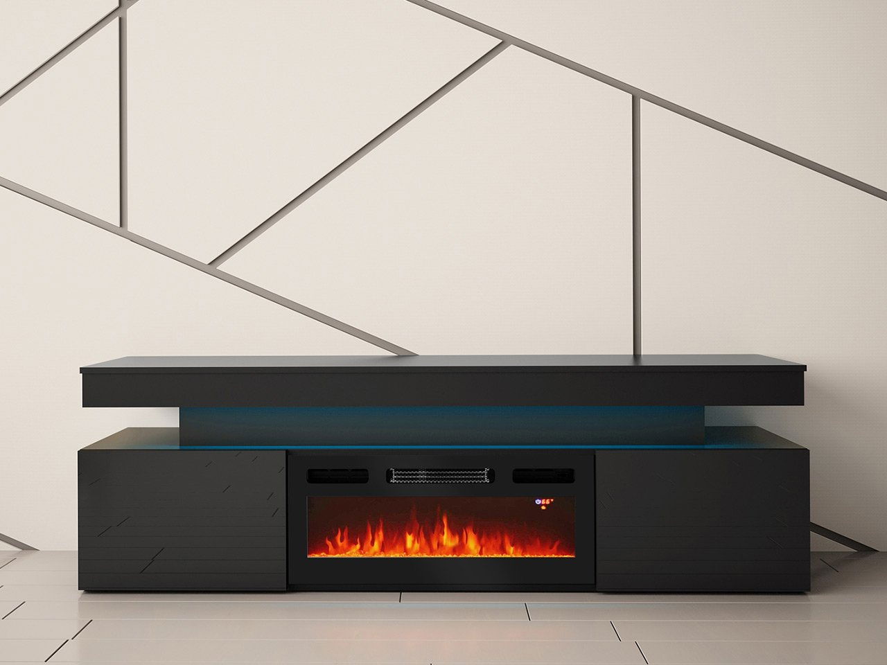 TV skříňka s krbem Lesteralo EF 2D 190 (černá + lesk černý) (s modrým LED osvětlením)