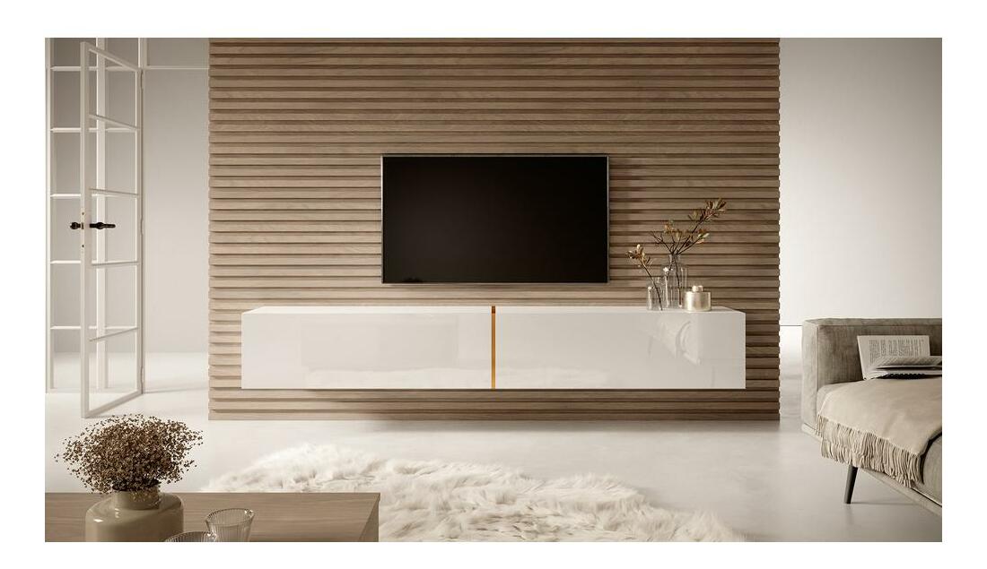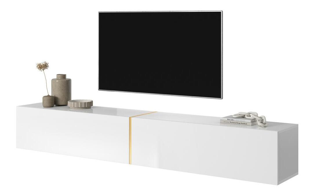 Sníte o obývacím pokoji zařízeném v glamour stylu? S TV skříňkou bude váš interiér vypadat jako z časopisu o interiérovém designu! Skříňka se vyznačuje jednoduchou formou, jejíž kouzlo umocňuje vertikální zlatá vložka ve středu korpusu, jakož i přední strana v lesku. Díky tomu to celé vypadá velice styl a úspěšně se stane ukázkou místnosti. Výhodou nábytku je jeho kapacita – dvě uzamykatelné skříňky úspěšně ukryjí jakékoli konzolové hry, dodatečné kabely či jiné drobnosti, kterým obvykle v místnosti chybí místo. Detaily produktu: skříňka je vyrobena z 16mm laminované desky, která je odolná vůči vlhkosti a poškrábání, což zajišťuje dlouhé používání, čela skříňky se otevírají směrem dolů, skříňka je závěsná, takže pod nábytkem lze snadno udržovat čistota, nábytek šířka: 200 cm, maximální zatížení nábytku: 14 kg, barva korpusu - matná bílá, barva přední strany - lesklá bílá.