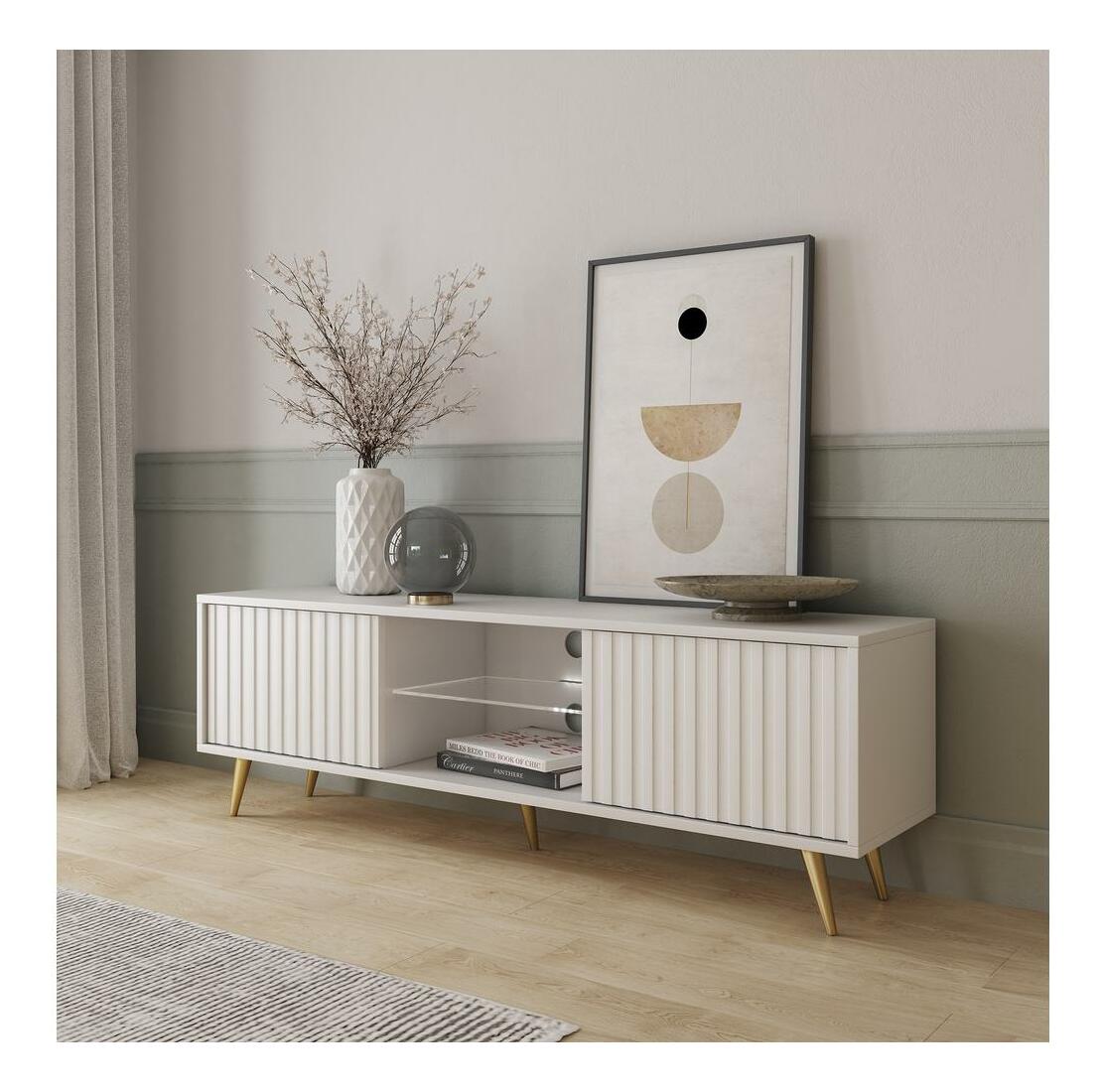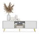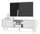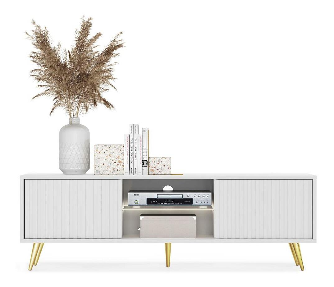 ZobrazitHledáte nábytek, který vám pomůže zařídit jedinečný prostor jako z časopisu o interiérovém designu? S TV skříňkou rychle a jednoduše změníte svůj obývací pokoj k nepoznání! TV skříňka má jedinečný design a funkčnost v jednom. Jednoduchá forma na zlatých, úzkých nožičkách je obohacena o módní lamely vpředu, díky čemuž působí celek velmi styl. Úspěšně zapadne do interiérů zařízených v moderním, minimalistickém a glamour stylu, kde se nepochybně stane ozdobou místnosti. Výhodou je velká kapacita uzavřených polic, které vám umožní skrýt soukromé věci před zraky hostů. Všechny doplňkové kabely pro zařízení, hry ke konzole a nabíječky si tam snadno najdou své místo a udrží tak v obýváku harmonický řád. Dvě otevřené police budou ideálním místem pro dekodér, konzoli nebo dekorativní krabičku s drobnostmi. Celý je završený LED osvětlením, které ve večerních hodinách vytvoří jedinečnou a romantickou atmosféru. Detaily produktu: korpus vyrobený - 16mm laminovaná deska, která je odolná proti vlhkosti a poškrábání, zajišťuje dlouhé používání, přední strana vyrobena - MDF deska s PVC fólií, nohy vyrobeny - ocel zlaté barvy, která zajišťuje stabilitu konstrukce, police s LED je vyroben ze skla, hrany nábytku jsou zpevněny ABS hranou, nábytek lze svépomocí sundat, barva: bílá.