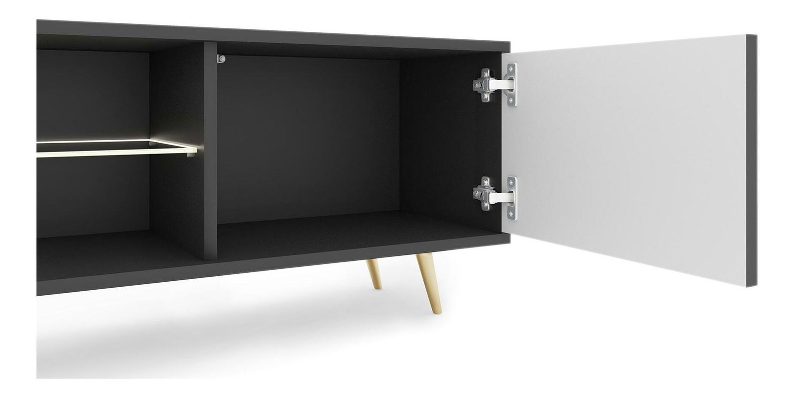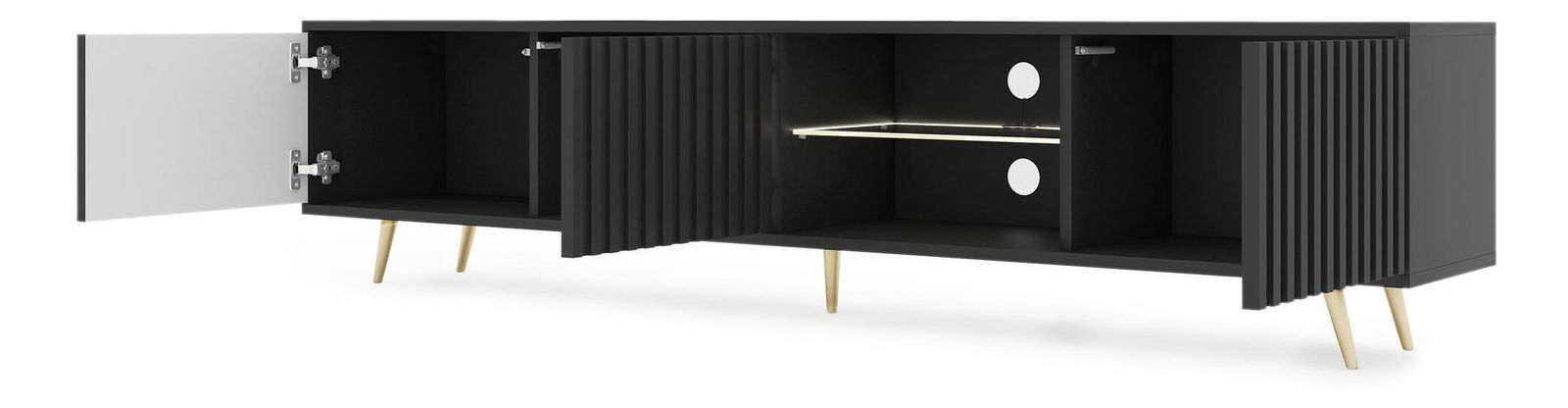 ZobrazitHledáte nábytek, který vám pomůže zařídit jedinečný prostor jako z časopisu o interiérovém designu? S TV skříňkou rychle a jednoduše změníte svůj obývací pokoj k nepoznání! TV skříňka má jedinečný design a funkčnost v jednom. Jednoduchá forma na černých úzkých nožičkách je obohacena o módní lamely vpředu, díky čemuž to celé působí velmi styl. Úspěšně zapadne do interiérů zařízených v moderním, minimalistickém a glamour stylu, kde se nepochybně stane ozdobou místnosti. Výhodou je velká kapacita tří uzavřených polic, které vám umožní ukrýt soukromé věci před zraky hostů. Všechny doplňkové kabely pro zařízení, hry ke konzole a nabíječky si tam snadno najdou své místo a udrží tak v obýváku harmonický řád. Dvě otevřené police budou ideálním místem pro dekodér, konzoli nebo dekorativní krabičku s drobnostmi. Celý je završen bílým LED osvětlením, které ve večerních hodinách vytvoří jedinečnou a romantickou atmosféru. Detaily produktu: korpus vyrobený - 16 mm laminovaná deska, která je odolná vůči vlhkosti a poškrábání, zajišťuje dlouhé používání, přední část vyrobena - MDF deska s PVC fólií, nohy vyrobeny - ocel, lakované na černo, což zajišťuje stabilitu konstrukce, police s LED vyrobeno ze skla, hrany nábytku zpevněno ABS hranou, nábytek pro svépomocnou montáž, barva: černá.