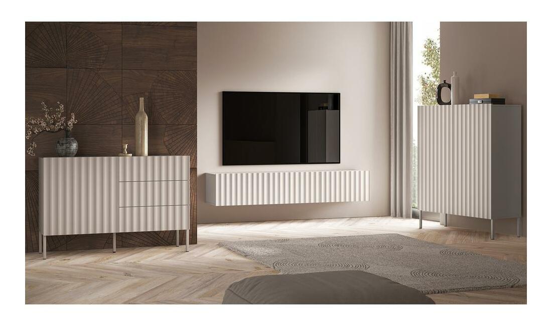 Hledáte jedinečný, moderní a zároveň funkční nábytek do vašeho interiéru? Kolekce splní všechna vaše očekávání Závěsná TV skříňka s jedinečným designem dokonale zapadne do moderních a minimalistických interiérů. Kašmírová barva dodává skříňce jemný šarm, který se perfektně hodí k většině aranžmá. Celá kolekce se vyznačuje rafinovaným detailem v podobě drážkovaných předních dílů, které dodávají každé místnosti jedinečný vzhled. Je navržen s ohledem na funkčnost a má tři prostorné police, do kterých můžete snadno umístit různé druhy předmětů v závislosti na vašich potřebách. Kolekce je nejen praktickým úložným řešením, ale také designovým prvkem, který zdůrazní individuální styl každé místnosti. Nečekejte a představte svému interiéru jedinečný charakter již dnes. barva korpusu, čela vyčnívající 7 mm nad desku, hrany chráněné proti mechanickému poškození melaninem, zadní stěna z bílého HDF, barva: kašmír.