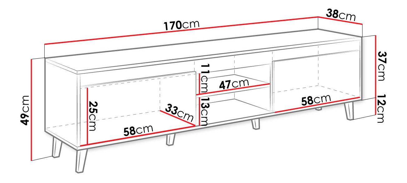 Máte rádi zajímavá a nadčasová řešení ve svých interiérech? Potom byste měli vidět televizní skříňka Evrona II, díky kterému bude váš interiér funkčnější! Tento model bude také skvělou dekorací, díky které budete mít vždy vše na dosah ruky. Televizní skříňka je vyrobena z laminované dřevotřísky v módním a univerzálním barevném schématu, imitujícím přírodní dřevo, s tmavými vložkami. Tento nábytek se perfektně hodí do moderních a průmyslových interiérů. Charakteristickým znakem této skříňky jsou vysoké nohy a naprostý nedostatek rukojetí. Televizní jednotka Elsie II je vybavena poličkou pro set-top box nebo konzolou a dvěma skrýšemi, které se otevírají směrem dolů.