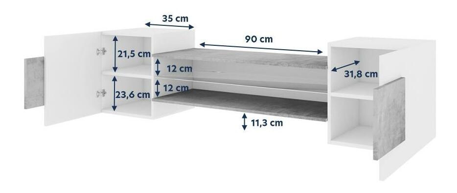 Jste milovníkem jednoduchých forem a hledáte dokonalý kus nábytku do vašeho TV koutku? Televizní skříňka to zvládne! je skvělý design s moderním nádechem. Skvěle zapadne do interiérů ve stylu loft nebo minimalistických aranžmá. Konstrukce je vyrobena z odolné laminované desky egger a je dostupná v několika okouzlujících barevných variantách. Vzhled však není všechno - je plně funkční TV stojan. Police dobře poslouží jako místo pro dekodér nebo konzoli. Dodatečné dálkové ovladače, podložky a příslušenství, které se vyplatí mít po ruce, ale ne na očích, lze úspěšně skrýt za uzavřená čela. Skříňka má volitelné LED osvětlení, které dokonale zvýrazní skleněnou polici a navodí do interiéru příjemnou a atmosférickou atmosféru. Celé je to umístěno na plastových nožičkách, tzv. 5 mm vysoké kluzáky, které izolují skříňku od podlahy a poskytují ochranu desce. Ochrana hran ve formě PVC pásku o tloušťce 0,5 mm zároveň chrání nábytek před škodlivými faktory. Doplňující informace: výška vybrání v základně nábytku: 12,1 cm, výška spodní police: 11 cm, šířka vybrání v desce stolu: 90 cm. Pozvěte a do svého obývacího pokoje!