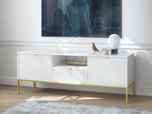 Skvost mezi televizním nábytkem! Má nejen jedinečný design a luxusní detaily. TV skříňka dodává místnosti svěžest a eleganci! Dokonale se kombinuje s různými styly interiérového designu. Jedním z nejpůvabnějších prvků nožní TV skříňky jsou frézované dekorace. Složitě vyřezávané lišty dodávají jedinečný šarm a vytvářejí fenomenální vzor, který upoutá každého. TV stolek je nejen estetickou dekorací, ale také funkčním kusem nábytku. Promyšlené vnitřní uspořádání poskytne dostatek prostoru pro odkládání multimediálních zařízení nebo jiného potřebného příslušenství. Přídavná polička bude ideální na set top box nebo konzoli.