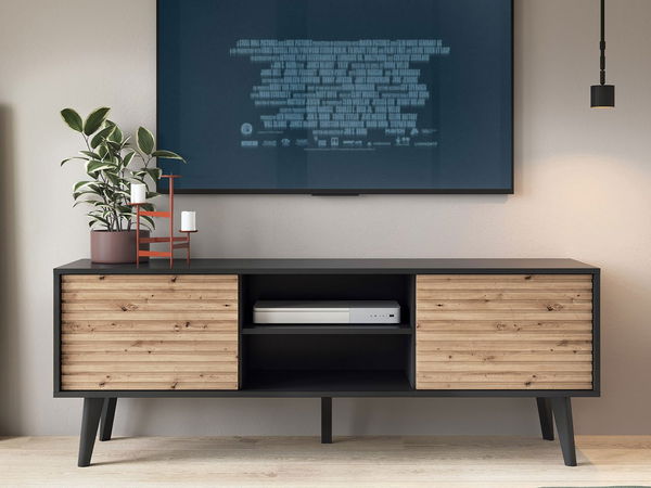 TV skříňka je stylový kus nábytku, který spojuje moderní vzhled s funkčností. Vyznačuje se černým vysokým nohama, které jí dodávají elegantní styl. Jedinečný charakter podtrhují frézovaná čela skříňky. Tento dekor jistě odlišuje TV skříňku do obývacího pokoje od ostatních modelů. Kromě toho má skříňka pod TV díky svému prostoru ideální úložný prostor pro elektronická zařízení a další příslušenství. Určitě se stane ústředním bodem uspořádání obývacího pokoje a dodá každému interiéru stylový nádech.
