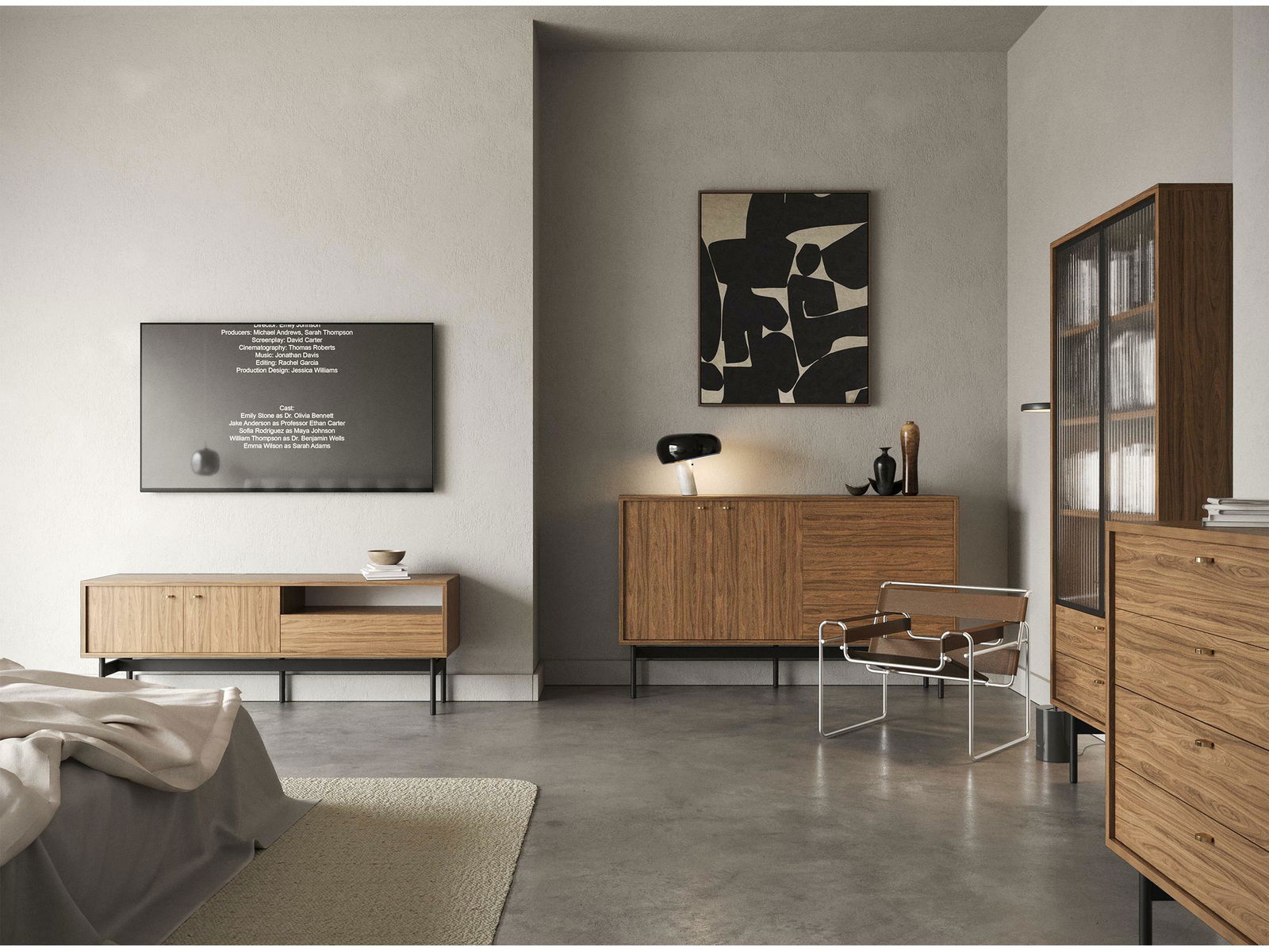 ZobrazitChcete změnit vzhled vašeho interiéru? Výběrem naší kolekce potěšíte své hosty tím, že vnesete do svého obývacího pokoje jedinečné uspořádání, zdůrazňující jemnost, eleganci a zároveň harmonii. TV skříňka s jedinečným designem dokonale zapadne do moderních interiérů. Je vyroben z kvalitní laminované dřevotřískové desky, která zajišťuje dlouhodobé a bezproblémové používání. Jeho charakter obohacuje pevný rám vyrobený z oceli, který činí nábytek nejen odolným, ale dodává mu i industriální šarm. Rafinovaný detail v podobě zlatých úchytek je zase nejen praktickým prvkem, který usnadňuje otevírání, ale dodává celé skříňce také jemný lesk. Skříňka byla navržena s ohledem na funkčnost, proto má otevřený výklenek na vybavení, zásuvku na drobnosti a uzavřený výklenek s policí. Přírodní ořech Carini v kombinaci s černým rámem a zlatými úchyty dodává interiéru jemný, ale rafinovaný charakter. Tento kus nábytku je nejen praktickým úložným řešením, ale také designovým prvkem, který zdůrazní individuální styl každé místnosti. Kolekce - vyberte si dokonalost do svého interiéru ještě dnes Detaily produktu: korpus a čela z přírodní laminované desky Carini Ořech H3710 ST9, rám vyrobený z černé prášek lakované oceli, která usnadňuje udržování pořádku pod nábytkem, zásuvka s zatlačováním! způsob otevírání k otevření“, rukojeti zlaté barvy z broušené oceli.