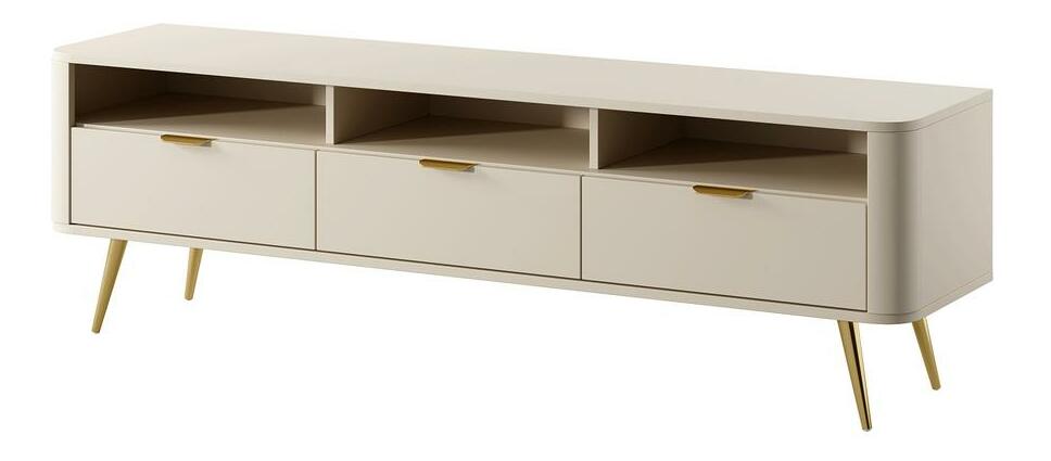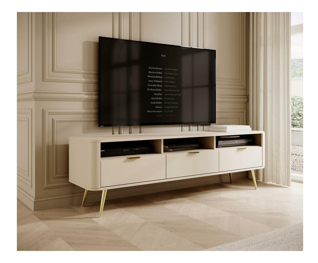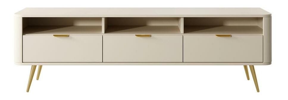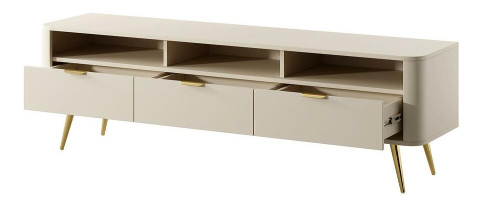ZobrazitNudí vás klasické tvary nábytku? Chcete změnit svůj byt? Vyberte si kolekci a překvapte všechny své hosty TV skříňka je moderní kus nábytku, který překvapí svým tvarem. Zaoblené hrany dodávají eleganci a jsou vhodné pro děti. Skříň má tři otevřené šachty, do kterých se vejde dekodér nebo konzola a tři zásuvky na kabely, drobnou elektroniku nebo dokumenty. Na velkou desku se kromě televizoru vejde také soundbar nebo čerstvá kytice květin Detaily produktu: korpus a čela z laminované nábytkové desky Pfleiderer U16003 v barvě Sand Beige, struktura vyztužená ABS hranami, které mu dodávají stabilitu a odolnost. vysoké ocelové nohy v chromové zlaté barvě s malými, bílými nožičkami, které zabraňují poškrábání podlahy, zásuvky umístěné na 27 mm kuličkových vodítkách, otvory v zadní stěně umožňují udržovat pořádek v kabelech, jemné zlato, broušené rukojeti dodávají.