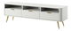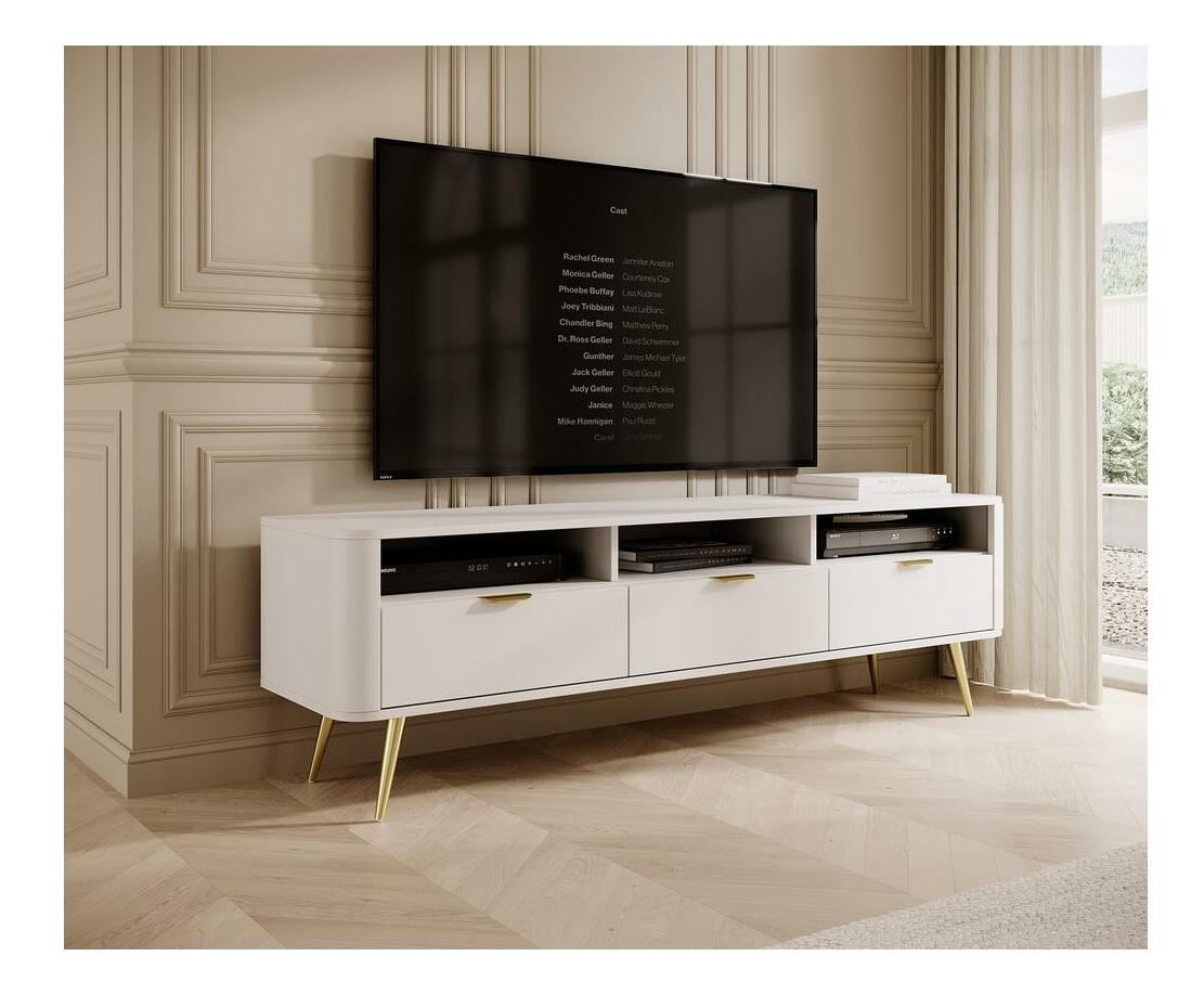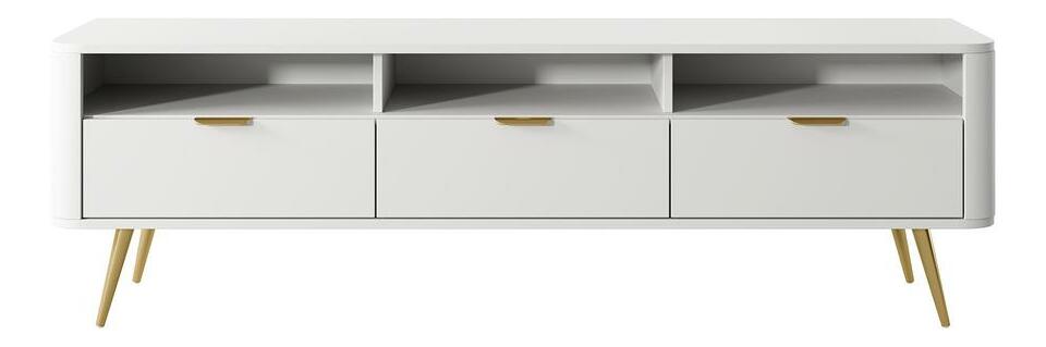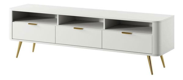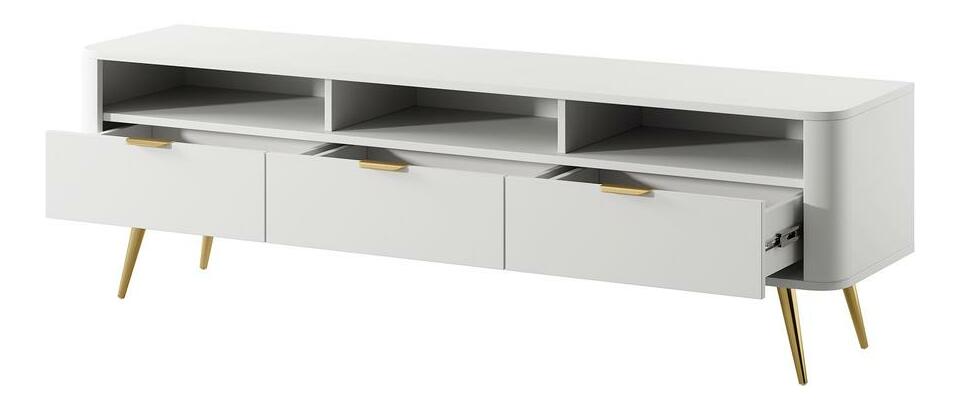 ZobrazitNudí vás klasické tvary nábytku? Chcete změnit svůj byt? Vyberte si kolekci a překvapte všechny své hosty TV skříňka je moderní kus nábytku, který překvapí svým tvarem. Zaoblené hrany dodávají eleganci a jsou vhodné pro děti. Skříň má tři otevřené šachty, do kterých se vejde dekodér nebo konzola a tři zásuvky na kabely, drobnou elektroniku nebo dokumenty. Na velkou desku se kromě televizoru vejde soundbar nebo čerstvá kytice květin Detaily produktu: korpus a čela z laminované nábytkové desky Kronospan 6459 SM v barvě Platinum White, konstrukce vyztužená ABS hranami, které mu dodávají stabilitu a odolnost. , vysoké, ocelové nožičky v chromové zlaté barvě mají malé, bílé nožičky, které zabraňují poškrábání podlahy, zásuvky jsou umístěny na 27 mm kuličkových vodítkách, otvory v zadní stěně umožňují udržovat pořádek v kabelech, jemné zlato, broušené rukojeti dodávají funkční předních dílů