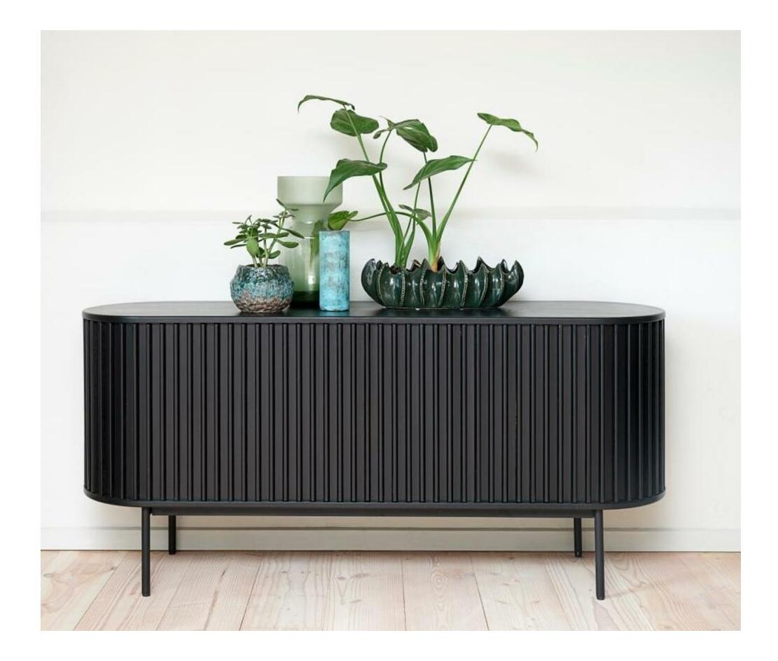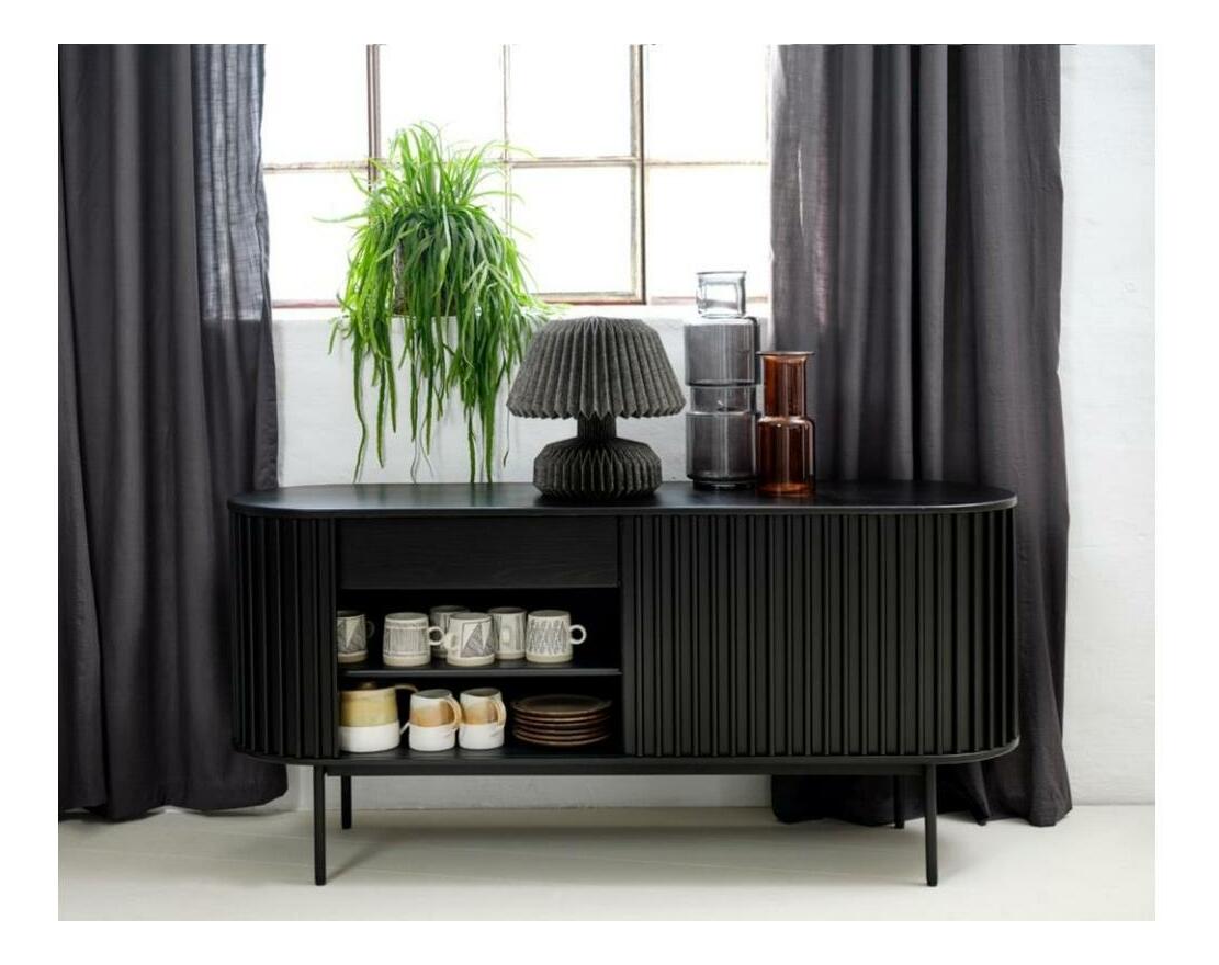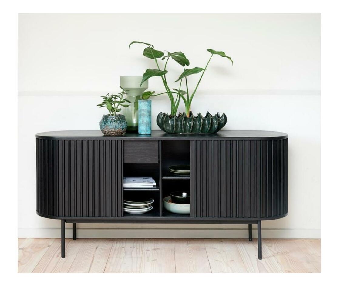 ZobrazitSníte o vkusně řešeném prostoru, kde budete moci relaxovat nebo trávit čas se svými blízkými? Funkční a zároveň mimořádně stylová kolekce nábytku bude perfektním návrhem pro vytvoření nového aranžmá! Široká komoda do obývacího pokoje je dokonalým řešením pro lidi, kteří chtějí mít ve věcech pořádek. Tento designový kus nábytku se může pochlubit dvojicí prostorných dvířek, která se zajímavým způsobem otevírají do stran a představují čtyři prostorné police. Snadno si zde uspořádáte své drobnosti – dokumenty, kancelářské doplňky, oblečení či nádobí – předměty zůstanou uspořádány na jednom místě a vy získáte přehledný a stylový interiér. Komoda je vyrobena z dubového dřeva lakovaného na černo. Tato kompozice potěší výrazným designem, ale zaujme také trvanlivostí a odolností vůči mechanickému poškození. Krásné lamely na přední straně nábytku jsou vkusným doplňkem. Detaily produktu: komoda z dubového dřeva, přírodní materiál s vysokou životností, odolností proti poškození a krásným vzhledem, povrch pokrytý ozdobnými drážkami, drážky jsou podélné, úzké drážky malé šířky a hloubky, které probíhají paralelně, nohy vyrobené z lakovaného z černého kovu, jsou odolné vůči rzi, a zároveň zajišťují vysokou stabilitu celé konstrukce, posuvné dveře, čtyři prostorné police, barva: černý dub.