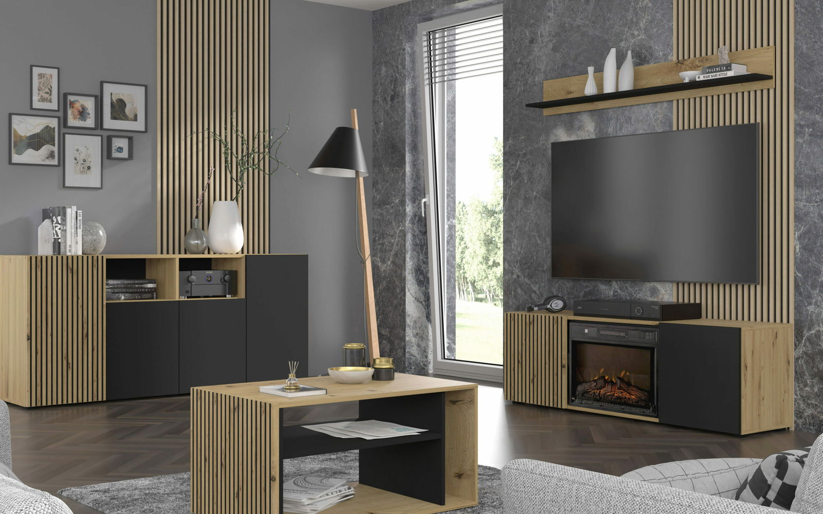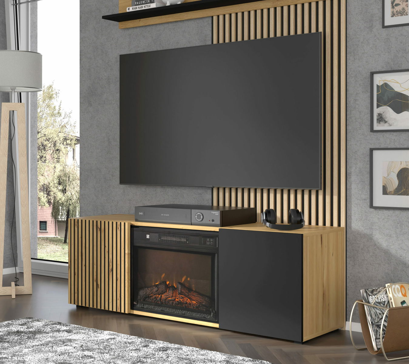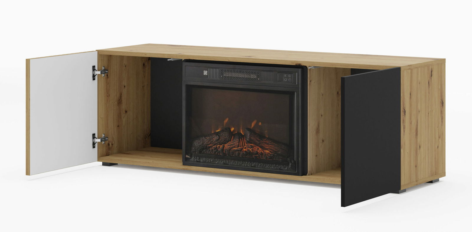 TV skříňka/stolek s krbem Aurella (černá + dub artisan)