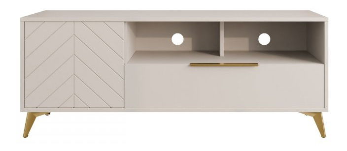 ZobrazitTV je ideální volbou pro ty, kteří hledají pohodlí a styl. Stylová TV skříňka Siprynt 1D1SZ na nožičkách spojuje funkčnost s dobrým designem. Mezi praktické výhody nábytku patří mimo jiné: velká úložná kapacita, prostorná skříňka i zásuvka rozdělená na 2 přihrádky jsou perfektním místem pro uložení různých druhů příslušenství. Otevřená police zajišťuje také estetické vystavení TV zařízení. Dekodér, reproduktory či jiné příslušenství na něm umístěné budou vypadat úhledně a budete k nim mít rychlý přístup. Vizuální kvality TV stolku Siprynt 1D1SZ vycházejí z neutrálních barev. Světlá barva podpořená zlatými detaily zdůrazňuje avantgardní charakter výzdoby obývacího pokoje. Designovým akcentem je frézování na čelech. Rozměry: šířka: 154 cm výška: 60 cm hloubka: 40 cm Provedení: korpus: 16 mm silná laminovaná deska čela: 16 mm silná MDF deska ABS hrana zadní stěna z HDF desky nohy a rukojeti: kov zlaté barvy panty na sklenice kuličková vedení dveře
