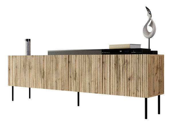 Vytvořte si jedinečné uspořádání interiéru pomocí skříňky. Jednoduchý klasický tvar byl rozbit ozdobnými dílky uspořádanými do nepravidelných drážek. Vzhled celku určují i detaily, jako jsou vysoké nožičky – tento zdánlivě malý prvek zcela mění design a dodává skříňce na TV osobitý charakter. Za zmínku stojí i vnitřní prostor RTV skříňky, který ukrývá až 6 prostorných polic různých velikostí, na které lze úspěšně uložit elektronické zařízení a jiné předměty potřebné v prostoru televizoru. Moderní charakter nábytku podtrhuje absence úchytek – čela se otevírají díky systému „push to open“.
