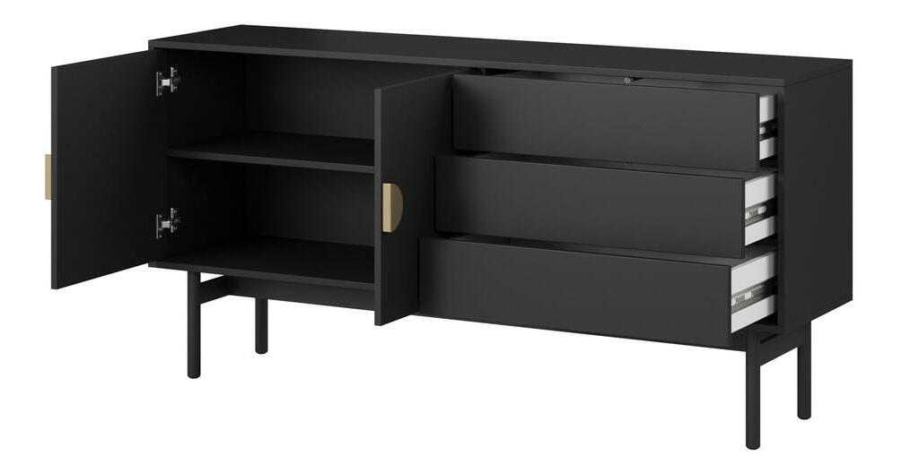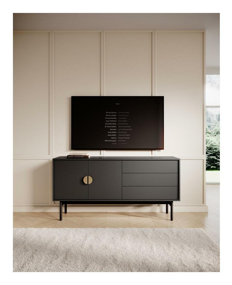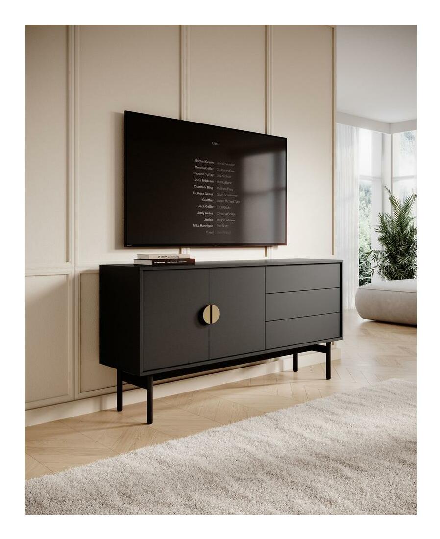 ZobrazitChcete udělat metamorfózu ve svém interiéru? Máte rádi originální řešení a jednoduché formy nábytku? Výběrem naší kolekce vnesete do interiéru harmonii a eleganci a potěšíte své hosty TV skříňka s jedinečným designem v elegantní barvě dokonale zapadne do moderních interiérů. Je vyroben z kvalitní laminované dřevotřískové desky, která zajišťuje dlouhodobé a bezproblémové používání. Jeho charakter obohacuje pevný rám vyrobený z oceli, který činí nábytek nejen odolným, ale dodává mu i industriální šarm. Zlaté úchytky tvořící kruh jsou zase nejen praktickým prvkem, který usnadňuje otevírání, ale dodávají celé skříňce eleganci a jemný lesk. Tento malý, ale rafinovaný detail odlišuje nábytek a dodává mu mírně luxusní akcent. Skříňka byla navržena s ohledem na funkčnost, proto má zásuvky na menší předměty a uzavřený výklenek na větší hrací boxy nebo elektronické vybavení. Kombinace klasické barvy s černým rámem a zlatými úchyty vytváří harmonický a moderní celek, který dokonale zapadne do různých interiérových aranžmá a dodá jim jedinečný charakter. Tato skříňka je nejen praktickým úložným řešením, ale také designovým prvkem, který ozdobí a zdůrazní individuální styl každé místnosti Detaily produktu: korpus a čela z laminované desky Black 0190 PE, odolná vůči vlhkosti, vysoké teplotě a poškrábání. rám vyroben z černé prášek lakované oceli, která usnadňuje udržování pořádku pod nábytkem, zásuvky otevírané metodou 'push to open', úchyty zlaté barvy z broušené oceli.
