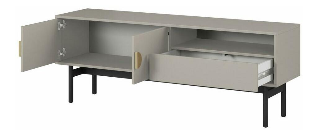 ZobrazitChcete udělat metamorfózu ve svém interiéru? Máte rádi originální řešení a jednoduché formy nábytku? Výběrem naší kolekce vnesete do interiéru harmonii a eleganci a potěšíte své hosty Televizní skříňka s jedinečným designem v elegantní béžové barvě dokonale zapadne do moderních interiérů. Je vyroben z kvalitní laminované dřevotřískové desky, která zajišťuje dlouhodobé a bezproblémové používání. Jeho charakter obohacuje pevný rám vyrobený z oceli, který činí nábytek nejen odolným, ale dodává mu i industriální šarm. Zlaté úchytky tvořící kruh jsou zase nejen praktickým prvkem, který usnadňuje otevírání, ale dodávají celé skříňce eleganci a jemný lesk. Tento malý, ale rafinovaný detail odlišuje nábytek a dodává mu mírně luxusní akcent. Skříňka byla navržena s ohledem na funkčnost, takže má zásuvku na menší předměty, otevřenou prohlubeň pro dekodér nebo audio zařízení a uzavřenou přihrádku na větší hrací boxy nebo elektronická zařízení. Kombinace nevšední barvy s černým rámem a zlatými úchyty vytváří harmonický a moderní celek, který dokonale zapadne do různých interiérových aranžmá a dodá jim jedinečný charakter. Tato skříňka je nejen praktickým úložným řešením, ale také designovým prvkem, který ozdobí a zdůrazní individuální styl každé místnosti Detaily produktu: korpus a čela vyrobená z laminované desky Grey Taupe U750 ST9, odolná vůči vlhkosti, vysoké teplotě a poškrábání. , rám vyrobený z černé prášek lakované oceli, která usnadňuje udržování pořádku pod nábytkem, zásuvky otevírané metodou 'push to open', úchyty zlaté barvy z broušené oceli.