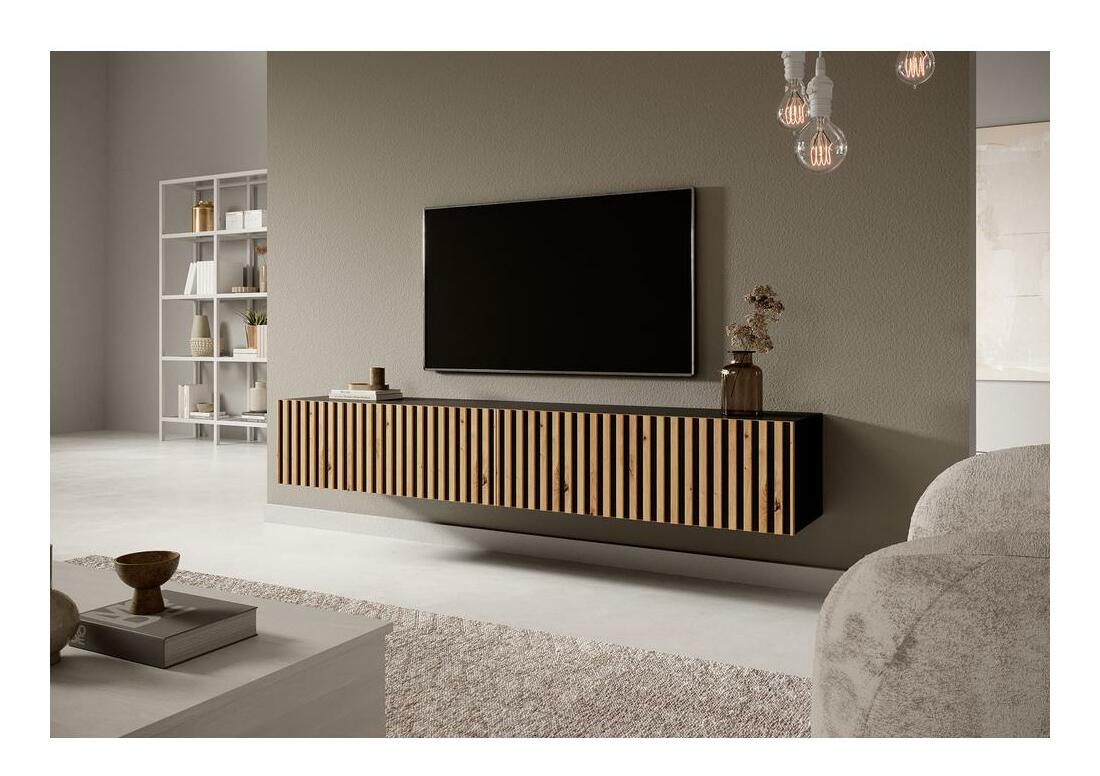 ZobrazitPokud jste fanouškem přírodních a teplých interiérů, TV skříňka určitě neunikne vaší pozornosti! Jeho jedinečná forma v kombinaci s funkčností je při zařizování útulné a ergonomické místnosti prvotřídní! Televizní skříňka se určitě stane výkladní skříní vašeho obývacího pokoje. Hodí se do modernistického i průmyslového uspořádání. Nejvíce však zapadne do přírodních interiérů zařízených v boho nebo botanickém stylu. V kombinaci s květinami a přírodními barvami bude působit velmi styl a aranžmá se stane atmosférickým a útulným – ideální pro relax po náročném dni v práci. Frézovaná přední strana s malovanými tmavými pruhy dodává celku šarm, opticky obohacuje jednoduchý tvar. Vnitřek je rozdělen na dvě prostorné skříňky, do kterých se úspěšně vejde jak příslušenství RTV, tak důležité dokumenty, které potřebujete mít vždy po ruce. Chcete-li si pokoj personalizovat, důležité rodinné suvenýry či fotografie si nepochybně najdou své místo na široké desce skříňky. Detaily produktu: korpus skříně je vyroben z 16mm laminované desky, která je odolná proti vlhkosti a poškrábání, což zajišťuje dlouhé používání, lamely jsou vyrobeny z MDF, čela skříně se otevírají směrem dolů, šířka nábytku: 175 cm, barva korpusu černá, barva přední strany: dub artisan + černá.