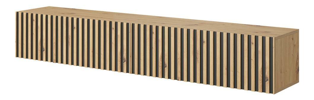 ZobrazitPokud jste fanouškem přírodních a teplých interiérů, TV skříňka určitě neunikne vaší pozornosti! Jeho jedinečná forma v kombinaci s funkčností je při zařizování útulné a ergonomické místnosti prvotřídní! Televizní skříňka se určitě stane výkladní skříní vašeho obývacího pokoje. Hodí se do modernistického i průmyslového uspořádání. Nejvíce však zapadne do přírodních interiérů zařízených v boho nebo botanickém stylu. V kombinaci s květinami a přírodními barvami bude působit velmi styl a aranžmá se stane atmosférickým a útulným – ideální pro relax po náročném dni v práci. Frézovaná přední strana s malovanými tmavými pruhy dodává celku šarm, opticky obohacuje jednoduchý tvar. Vnitřek je rozdělen na dvě prostorné skříňky, do kterých se úspěšně vejde jak příslušenství RTV, tak důležité dokumenty, které potřebujete mít vždy po ruce. Chcete-li si pokoj personalizovat, důležité rodinné suvenýry či fotografie si nepochybně najdou své místo na široké desce skříňky. Detaily produktu: korpus skříně je vyroben z 16mm laminované desky, která je odolná vůči vlhkosti a poškrábání, což zajišťuje dlouhé používání, lamely jsou vyrobeny z MDF, čela skříně se otevírají směrem dolů, šířka nábytku: 175 cm, barva korpusu: dub artisan, barva přední strany: artisan dub + černá.