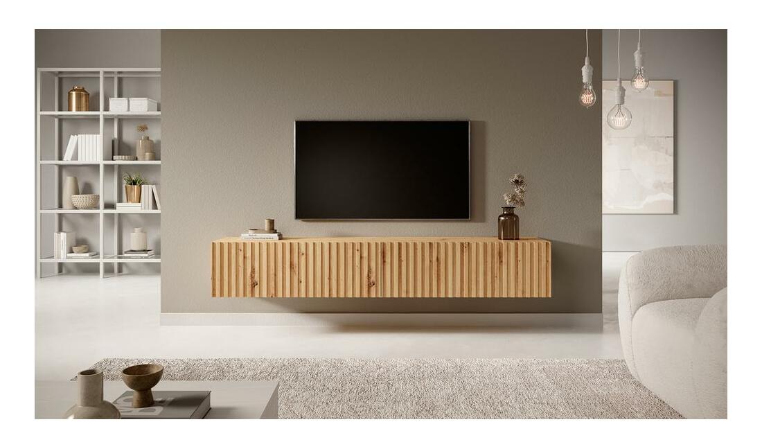 ZobrazitPokud jste fanouškem přírodních a teplých interiérů, TV skříňka určitě neunikne vaší pozornosti! Jeho jedinečná forma v kombinaci s funkčností je při zařizování útulné a ergonomické místnosti prvotřídní! Televizní skříňka se určitě stane výkladní skříní vašeho obývacího pokoje. Hodí se do modernistického i průmyslového uspořádání. Nejvíce však zapadne do přírodních interiérů zařízených v boho nebo botanickém stylu. V kombinaci s květinami a přírodními barvami bude působit velmi styl a aranžmá se stane atmosférickým a útulným – ideální pro relax po náročném dni v práci. Půvab celku dodává frézovaná přední strana, která opticky obohacuje jednoduchý tvar. Vnitřek je rozdělen na dvě prostorné skříňky, do kterých se úspěšně vejde jak příslušenství RTV, tak důležité dokumenty, které potřebujete mít vždy po ruce. Chcete-li si pokoj personalizovat, důležité rodinné suvenýry či fotografie si nepochybně najdou své místo na široké desce skříňky. Detaily produktu: korpus skříně je vyroben z 16mm laminované desky, která je odolná vůči vlhkosti a poškrábání, což zajišťuje dlouhé používání, lamely jsou vyrobeny z MDF, čela skříně se otevírají směrem dolů, šířka nábytku: 175 cm, barva: dub artisan .