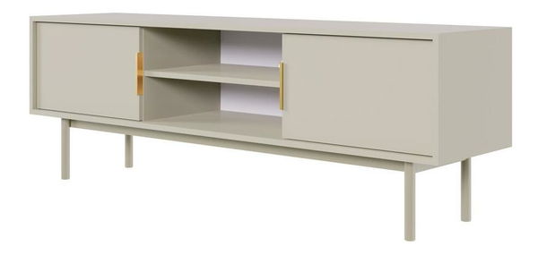 Vybíráte moderní nábytek, který vám bude sloužit několik let? Máte rádi jednoduchost a klasické tvary? Výběrem kolekce vnesete do svého interiéru elegantní styl a závan svěžesti TV skříňka je dokonalou kombinací funkčnosti a elegance. Jeho klasická barva spolu se zlatými, prodlouženými úchyty dodávají interiéru jemný a moderní charakter. Skříňka vyrobená z kvalitní laminované desky zaujme nejen svým vzhledem, ale také odolností, dodávají jí lehké dřevěné nohy a zároveň zdůrazňují její stabilitu. Designéři si dali záležet na každém detailu a vytvořili kus nábytku, který dokonale zapadne do moderního designu interiéru. Skříň má dvě uzavřené prohlubně, do kterých se vejde různé vybavení a dvě otevřené police pro dekodér nebo konzoli. Další výhodou je otvor v zadní stěně, který umožňuje vedení kabelů tak, aby se nezamotávaly do polic a zajišťuje cirkulaci vzduchu, což zabraňuje přehřívání zařízení. Minimalistický design skříně ve spojení s vysokou kvalitou zpracování z ní činí dokonalý doplněk moderního elegantního interiéru Detaily produktu: korpus vyrobený z laminované dřevotřískové desky Cashmere 5981 BS tloušťky 16 mm, která je odolná vůči poškrábání a vlhkosti, konstrukce vyztužená. Okraje 0,8 mm a 0,45 mm, které dodávají odolnost a stabilitu, zadní strana pokryta papírem pro zpevnění celku, klapky otevírané směrem dolů umístěné na plynových pohonech, panty s funkcí tichého zavírání.
