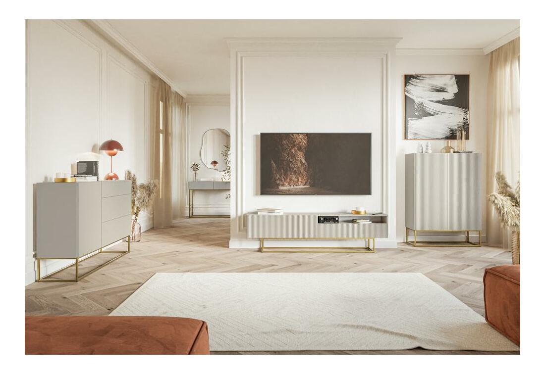 ZobrazitZařizujete si svůj vysněný obývací pokoj ak dokončení díla potřebujete jen dokonalou TV skříňku? V takové situaci vám nabídneme naši jedinečnou TV skříňku - kus nábytku, který nebudete lhostejně utrácet TV skříňka je spojením minimalismu s designovým akcentem v podobě módních lamel dodává celku jedinečný charakter - v kombinaci s velkým, S barevnými rostlinami bude nábytek vypadat opravdu skvěle. Vnitřek je rozdělen na dvě uzamykatelné prostorné skříňky, do kterých se úspěšně vejde příslušenství RTV a důležité dokumenty, které musíte mít vždy po ruce, a otevřený výklenek – ideální pro dekodér nebo sadu reproduktorů. Chcete-li si pokoj personalizovat, důležité rodinné suvenýry či fotografie si nepochybně najdou své místo na široké desce skříňky. Další výhodou nábytku jsou pevné nohy v podobě rámu z prášku lakované oceli, které mu poskytují maximální stabilitu a zároveň jsou stylovým doplňkem do obývacího pokoje. Detail produktu: korpus skříně je vyroben z 16mm laminovaná deska U750 ST9 Grey Taupe, která je odolná vůči vlhkosti a poškrábání, což zajišťuje dlouhé používání, lamely na přední straně jsou vyrobeny z MDF, čela skříněk se otevírají směrem dolů metodou push to open, nohy jsou vyrobeny z prášku -ocel s povrchu úpravou, s kluzáky proti poškrábání podlahy