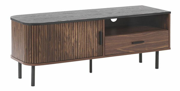 Tato vysoce funkční TV skříňka je nezbytným doplňkem každého obývacího pokoje. Prostorná vrchní deska skříňky zaručuje, že se na ni vejdou televizory s úhlopříčkou až 54ʺ a otvor pro kabely v zadní části zase zaručuje jeho jednoduché připojení. předmětů a dekorací. Celkový design a povrch v odstínu tmavého dřeva dokonale zapadne do obýváků laděných v retro stylu.