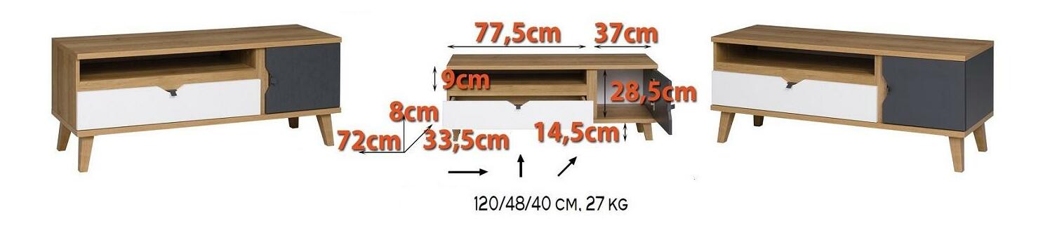 Tv stolek Mimone RTV (Dub zlatý + Bílá matná + Grafit) výška 48 cm, hloubka 40 cm je moderní a funkční nábytek pro váš obývací prostor. Jeho elegantní design a kombinace barev Dub zlatý, Bílá matná a Grafit přinesou do vašeho interiéru stylový vzhled. Stolek je vyroben z kvalitních materiálů a má ABS hrany, kovové úchyty, lišty a plastové nohy. Díky své výšce a hloubce je ideální pro umístění vašeho televizoru a dalších zařízení. Tv stolek Mimone RTV je dodáván v jednom balíku o rozměrech 137x43x9,5 cm a váhou 27 kg. Stolek má také zásuvky a vložky ve dvířkách, které poskytují dostatek úložného prostoru pro vaše věci. S tímto praktickým a moderním stolkem vám nebude chybět nic, co potřebujete ke zpříjemnění vašeho obývacího prostoru.
