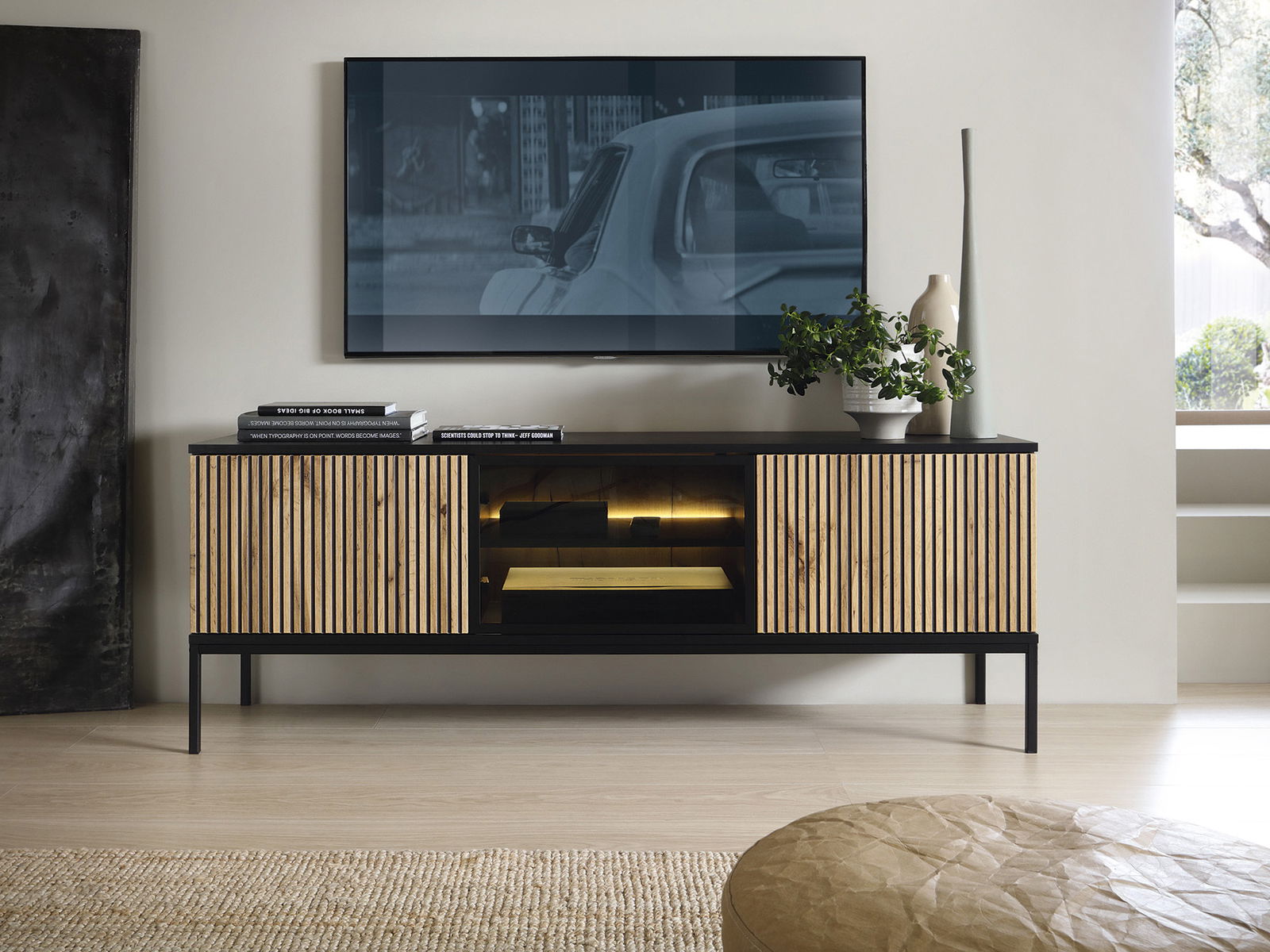 TV stolek Silvano RTV154 (černá + dub wotan) s LED osvětlením je dokonalou volbou pro ty, kteří hledají praktické a elegantní řešení pro svůj obývací prostor. Vysoký 56 cm a široký 154 cm stolek nabízí dostatek místa pro vaši televizi, herní konzole a další zařízení. S LED osvětlením můžete vytvářet atmosféru a přizpůsobit osvětlení dle vašich potřeb. Kombinace černé a dubového wotanu vytváří moderní a sofistikovaný vzhled, který doplní váš interiér. S hloubkou 39 cm je tento TV stolek ideální volbou pro ty, kdo hledají praktické a elegantní řešení pro svůj obývací prostor.