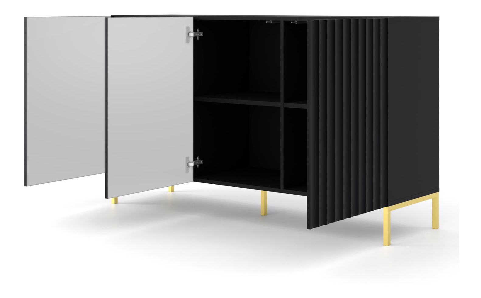 ZobrazitSkříňka z kolekce je prostorná a poskytuje dostatek úložného prostoru. Nábytek o šířce 200 cm má 4 uzamykatelné přihrádky a další vnitřní police, které usnadňují organizaci. Komoda je vybavena bezúchytkovým systémem – přední části se otevírají systémem push to open.
