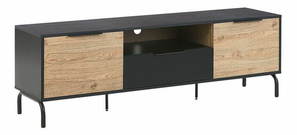 Zkrášlete svůj obývací pokoj s touto televizní skříňkou, která nejenže nabízí dostatek úložného prostoru, ale také přitahuje pozornost a rychle se stane ústředním bodem v místnosti. Komoda má prostornou zásuvku, kterou lze použít pro uložení dálkových ovladačů, kabelů či jiných potřebných předmětů. Kromě toho má dvě praktické skříňky, které jsou ideální pro uložení knih či jiných dokumentů. V zadní části nábytku se nachází otvor, který umožňuje průchod kabelů. Skříňka je vyrobena z dřevotřískové desky nenáročné na údržbu, přičemž stabilitu výrobku zajišťují kovové nohy v ladící černé barvě.